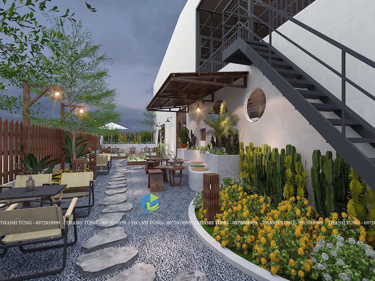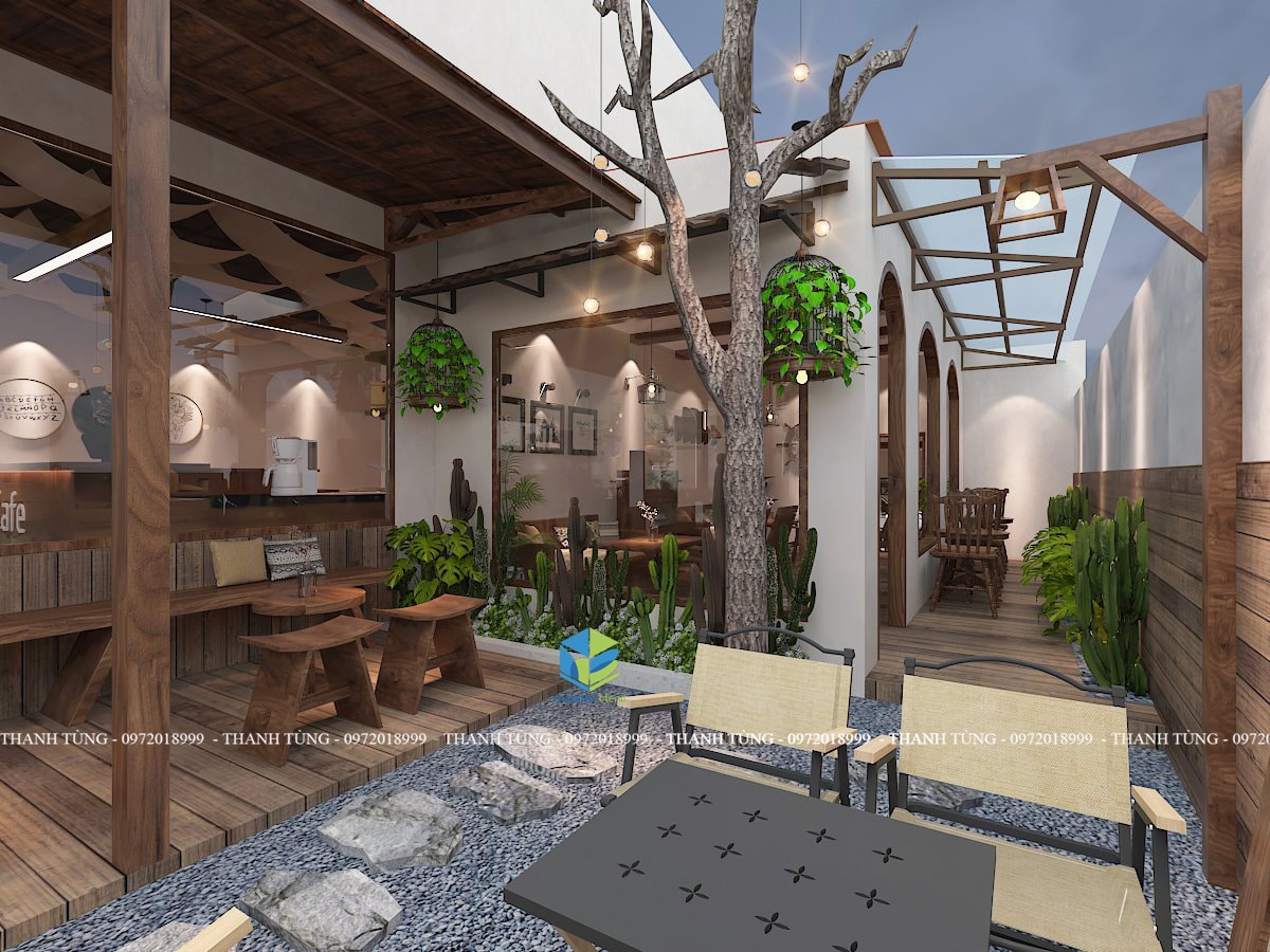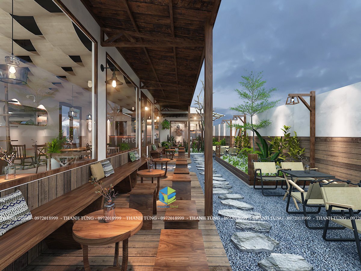 Biến khu vực ngoài trời thành một khu vườn xanh mát là ước mơ của chủ đầu tư. Phần sàn được giải đá, thoạt nhìn như những ô đá tạo hình lối đi  tạo cảm giác thích thú. Một phần làm sàn gỗ giật cấp rất nghệ thuật. Xung quanh trồng nhiều loại cây bóng râm, bố trí nội thất khoa học tạo ra nhiều khoảng trống  đem đến cảm giác thoải mái và thư giãn cho khách hàng.