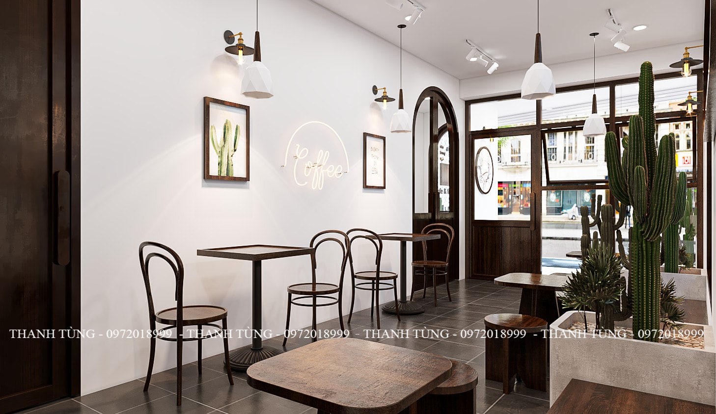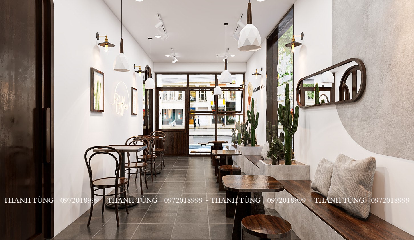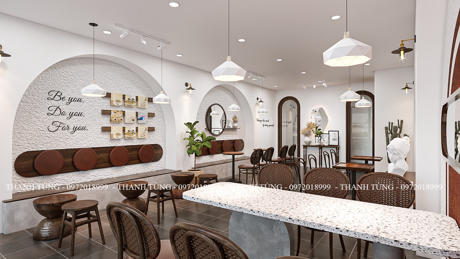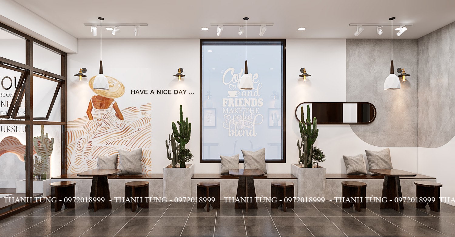 Tông màu chủ đạo trắng , xám kết hợp với màu trầm của gỗ tự nhiên, tạo nên một không gian hiện đại mà ấm áp , rất thích hợp cho các bạn tới thưởng thức cafe và thư giãn
