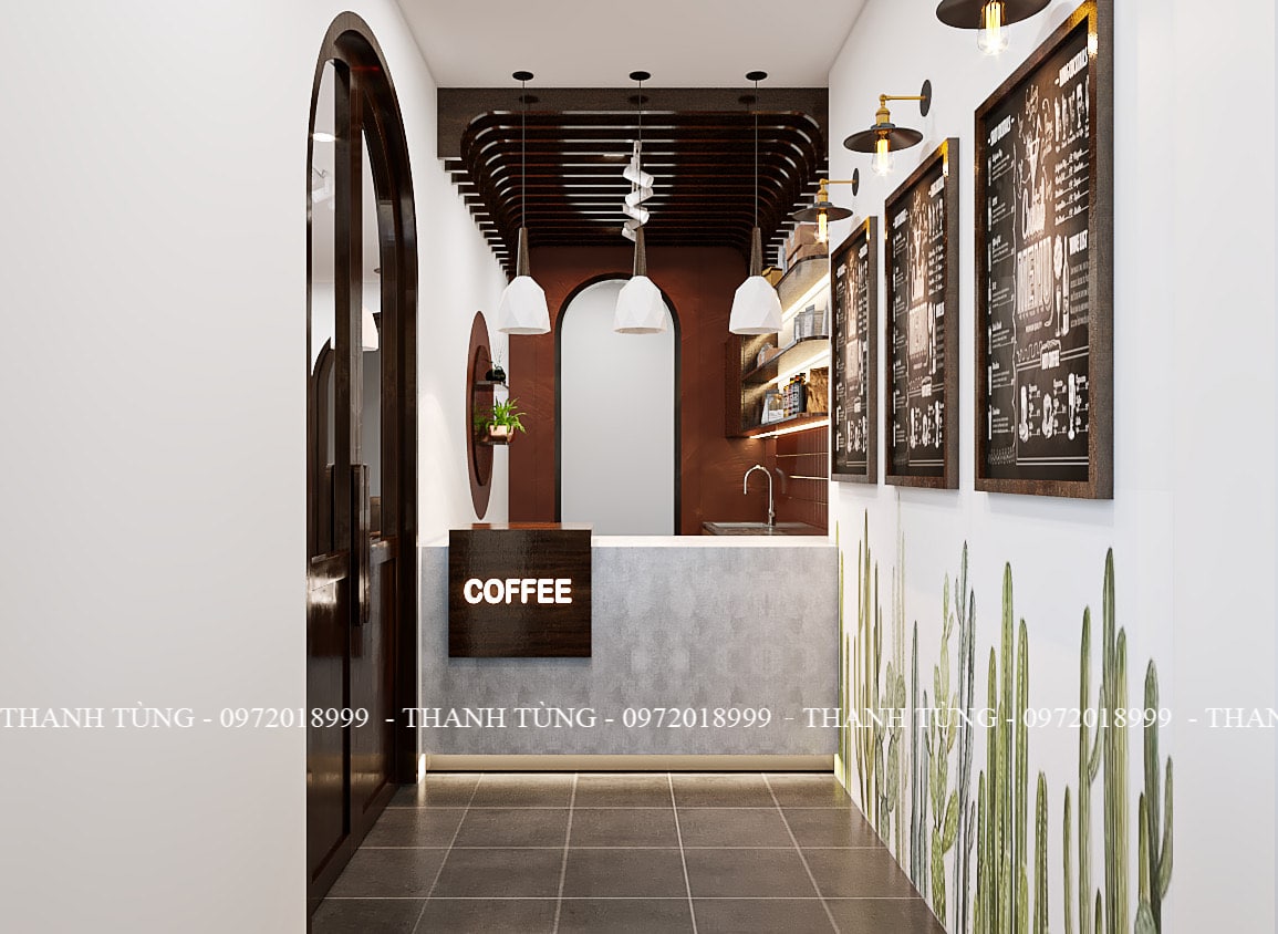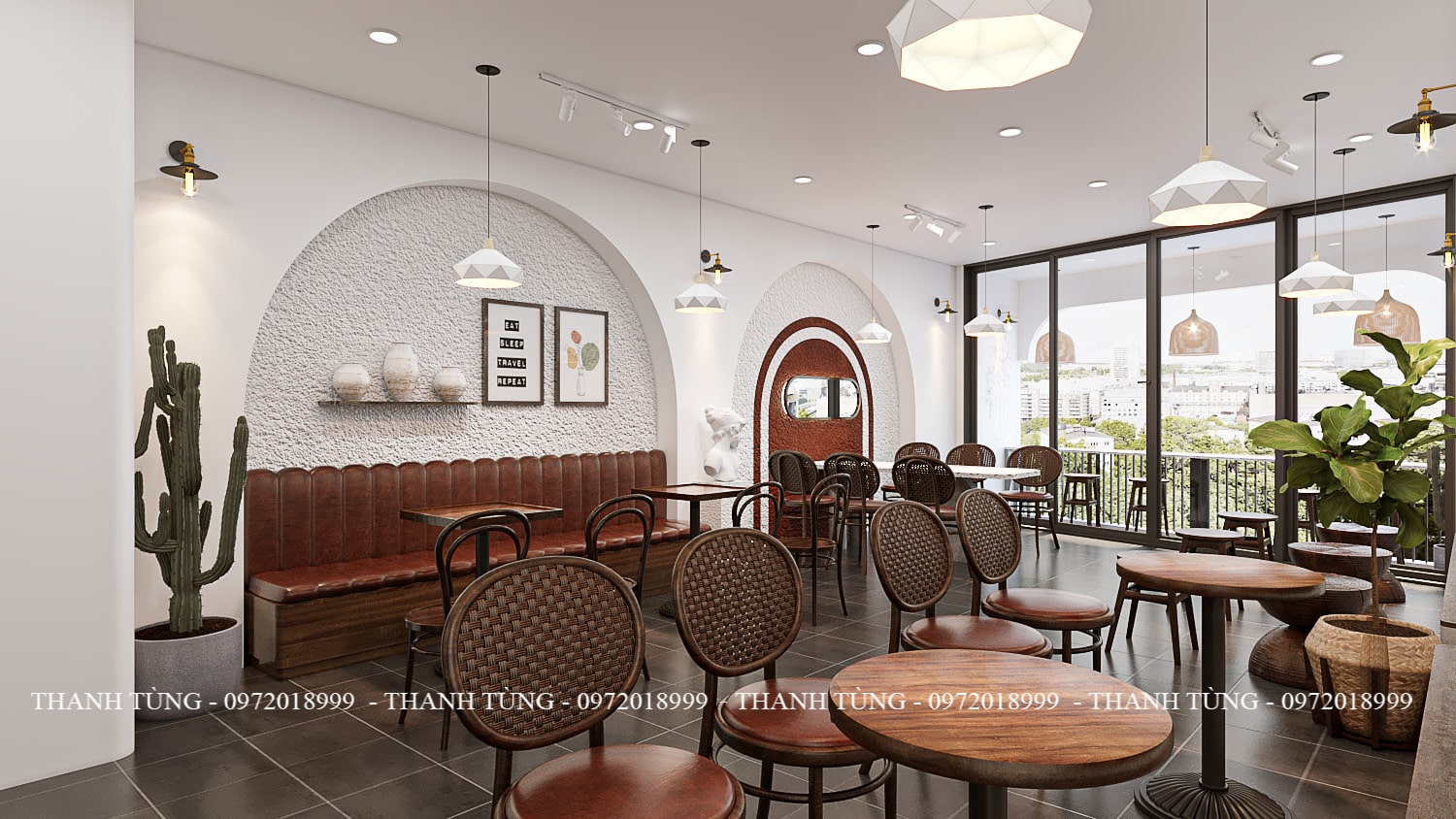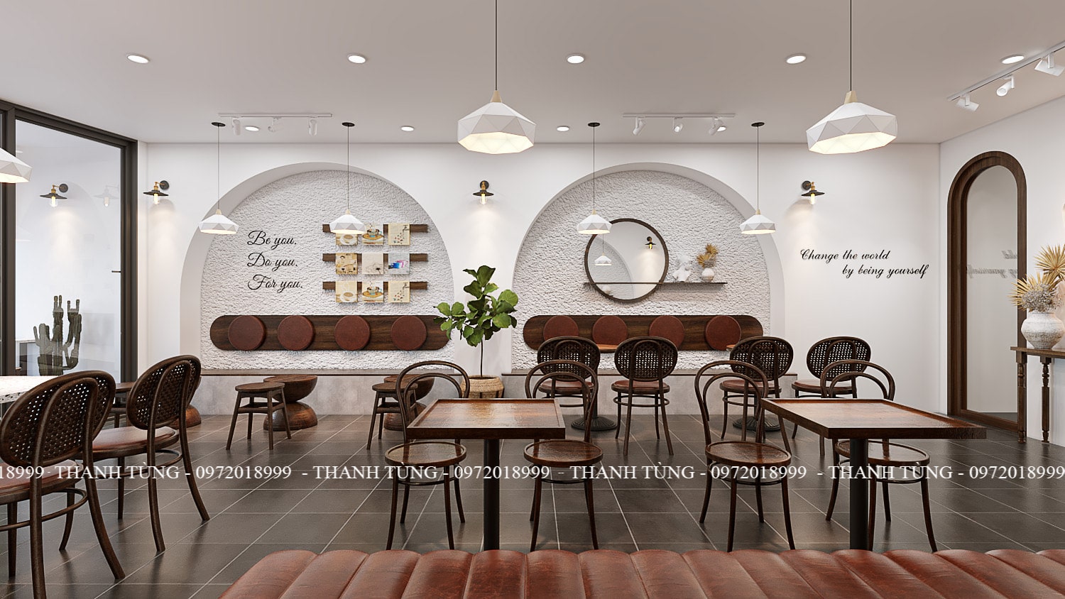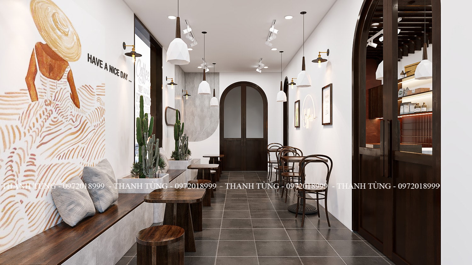 Tông màu chủ đạo trắng , xám kết hợp với màu trầm của gỗ tự nhiên, tạo nên một không gian hiện đại mà ấm áp , rất thích hợp cho các bạn tới thưởng thức cafe và thư giãn