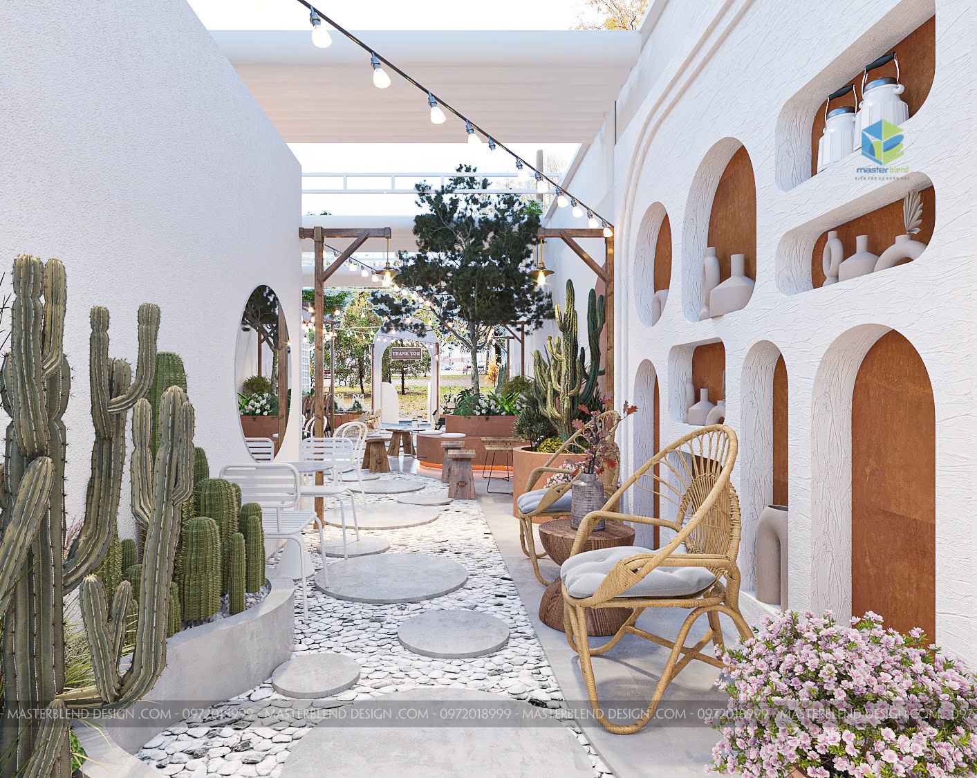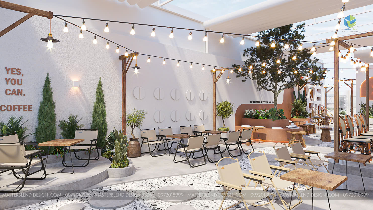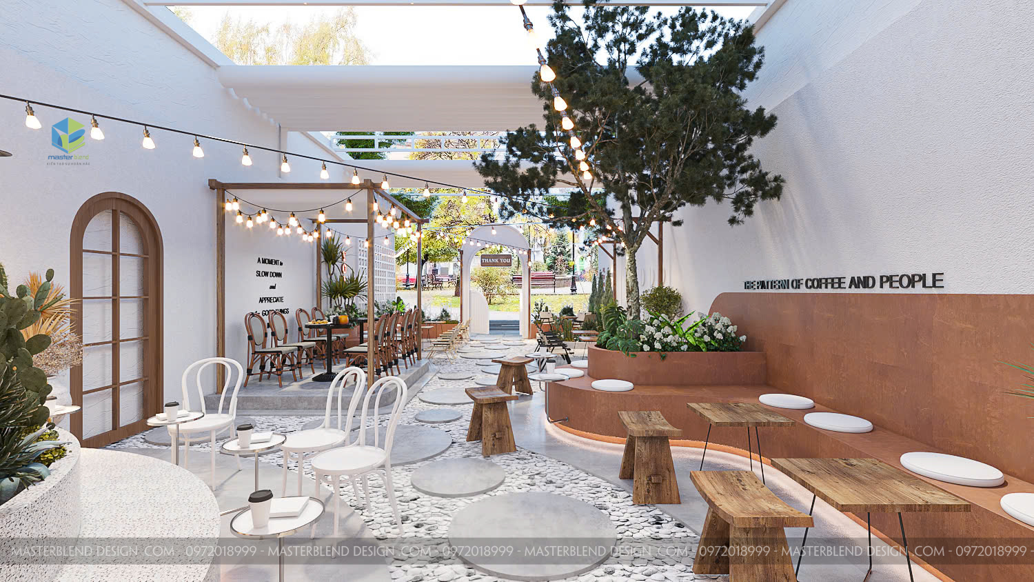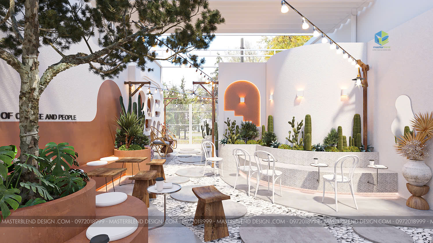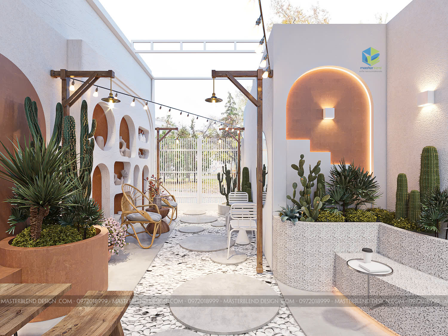 Không gian được thiết kế mở với các mảng tường trắng, kết hợp với kệ trang trí vòm cong, tạo nên sự hài hòa. Khu vực bàn ghế ngoài trời kết hợp với các loại cây xương rồng và hoa nhỏ, tạo nên cảm giác như đang hòa mình vào một khu vườn thiên nhiên đầy thơ mộng. Với nhiều không gian và góc check in xinh tươi, thoả sức cho các bạn trẻ tận hưởng và thưởng thức đồ uống, thư giãn.