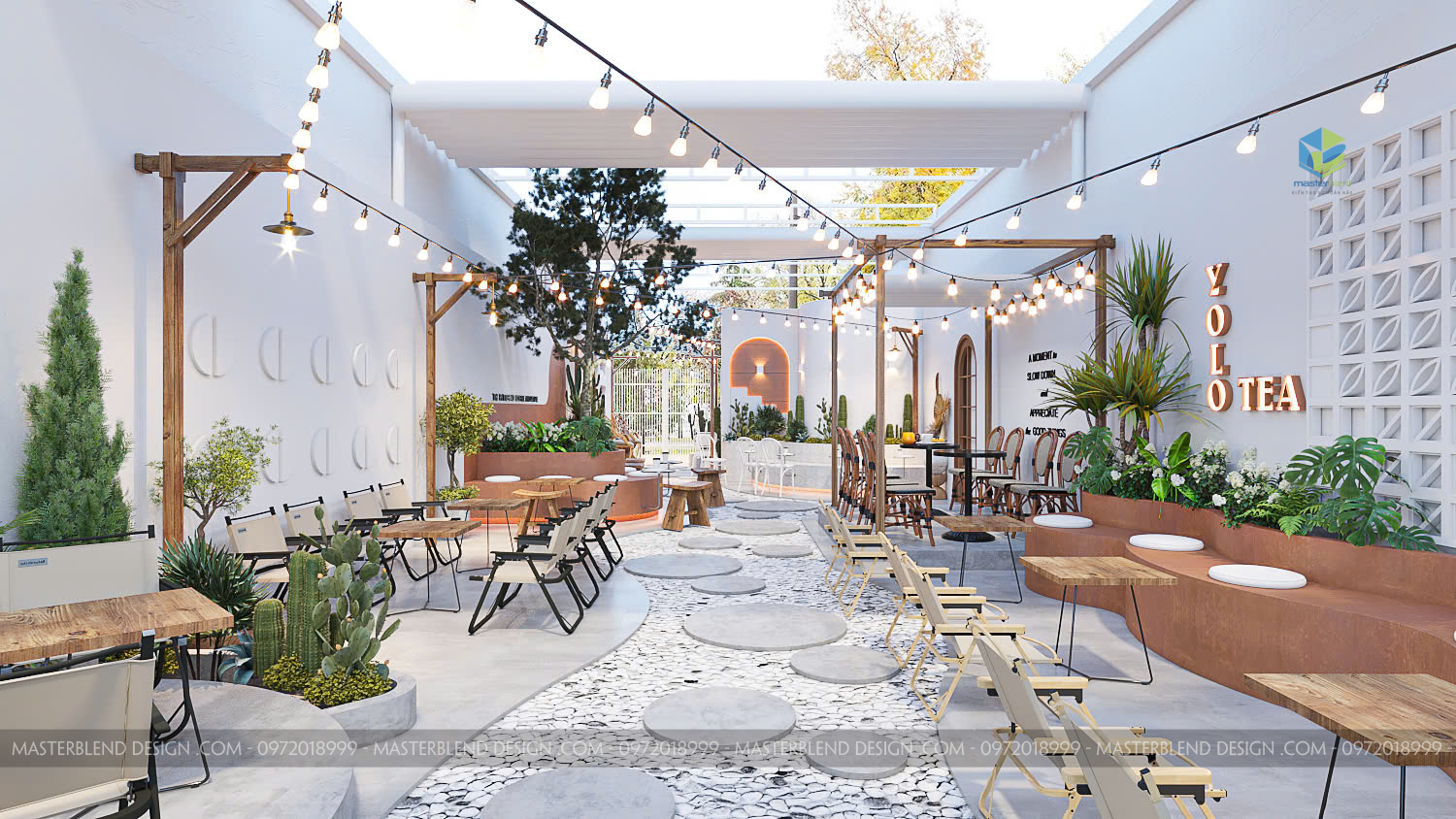 Quán YOLO TEA được MasterBlend thiết kế và thi công trên một nền đất trống, mang phong cách cafe sân vườn thoáng đãng, hướng đến sự giao thoa giữa thiên nhiên và đời sống đô thị.