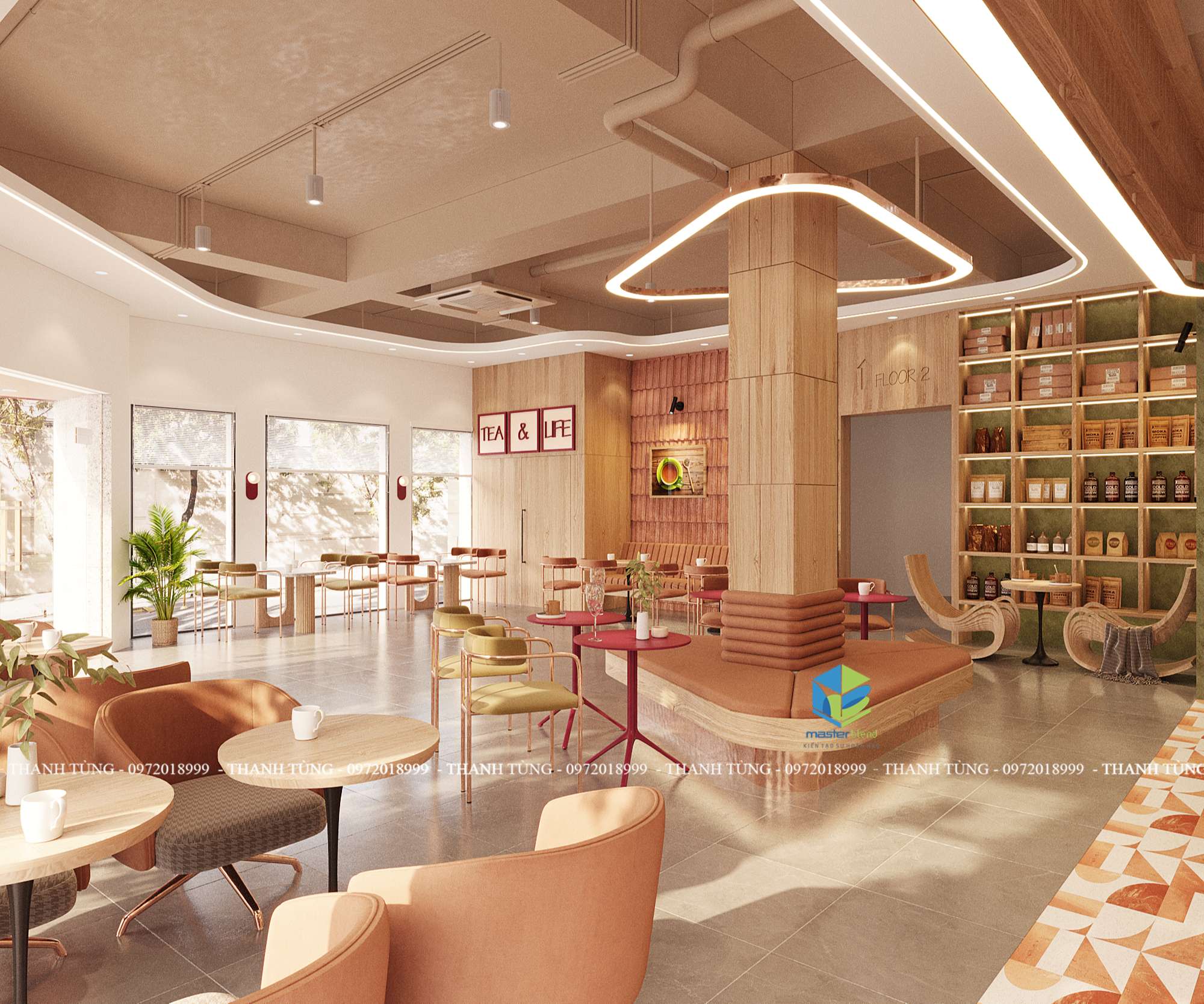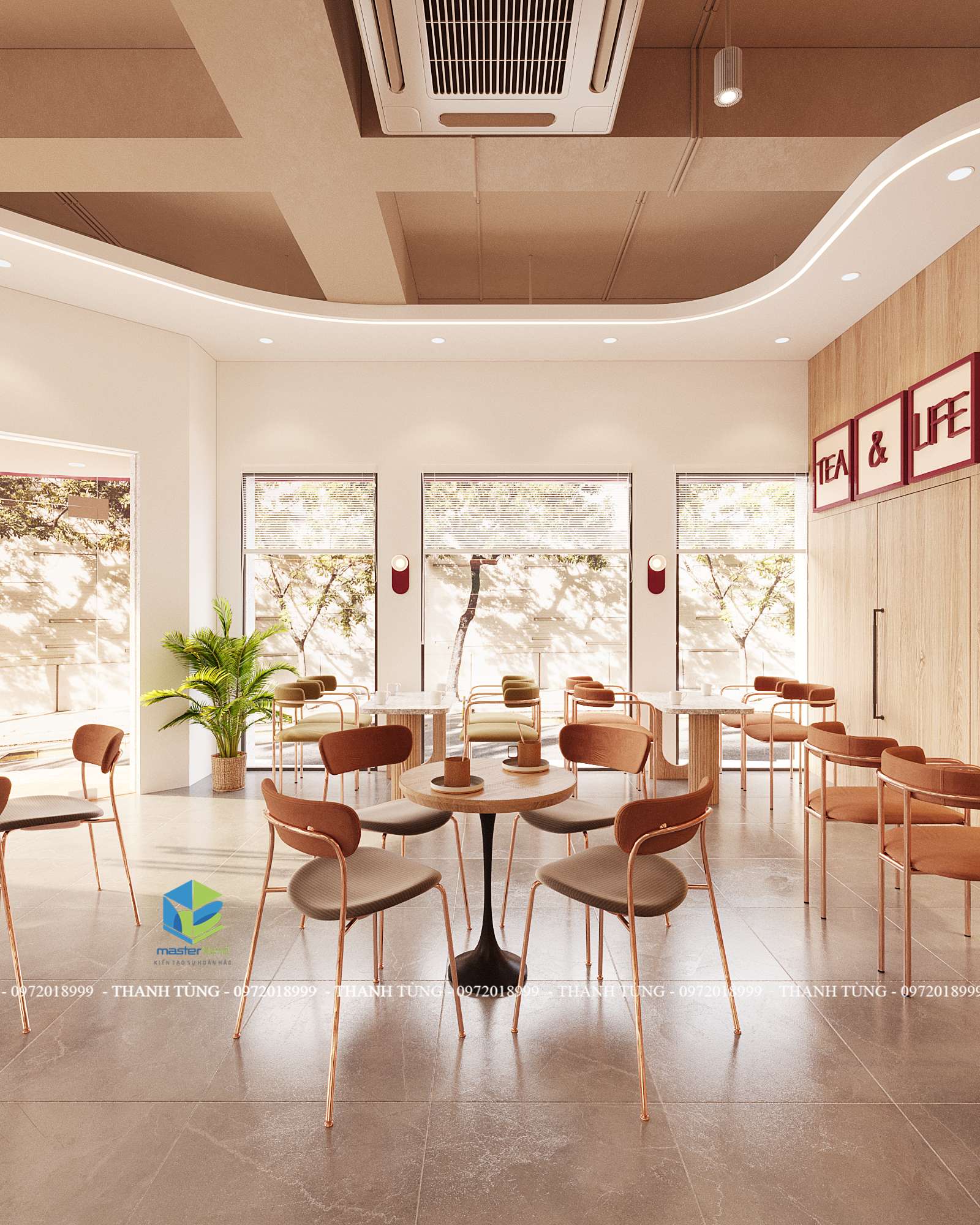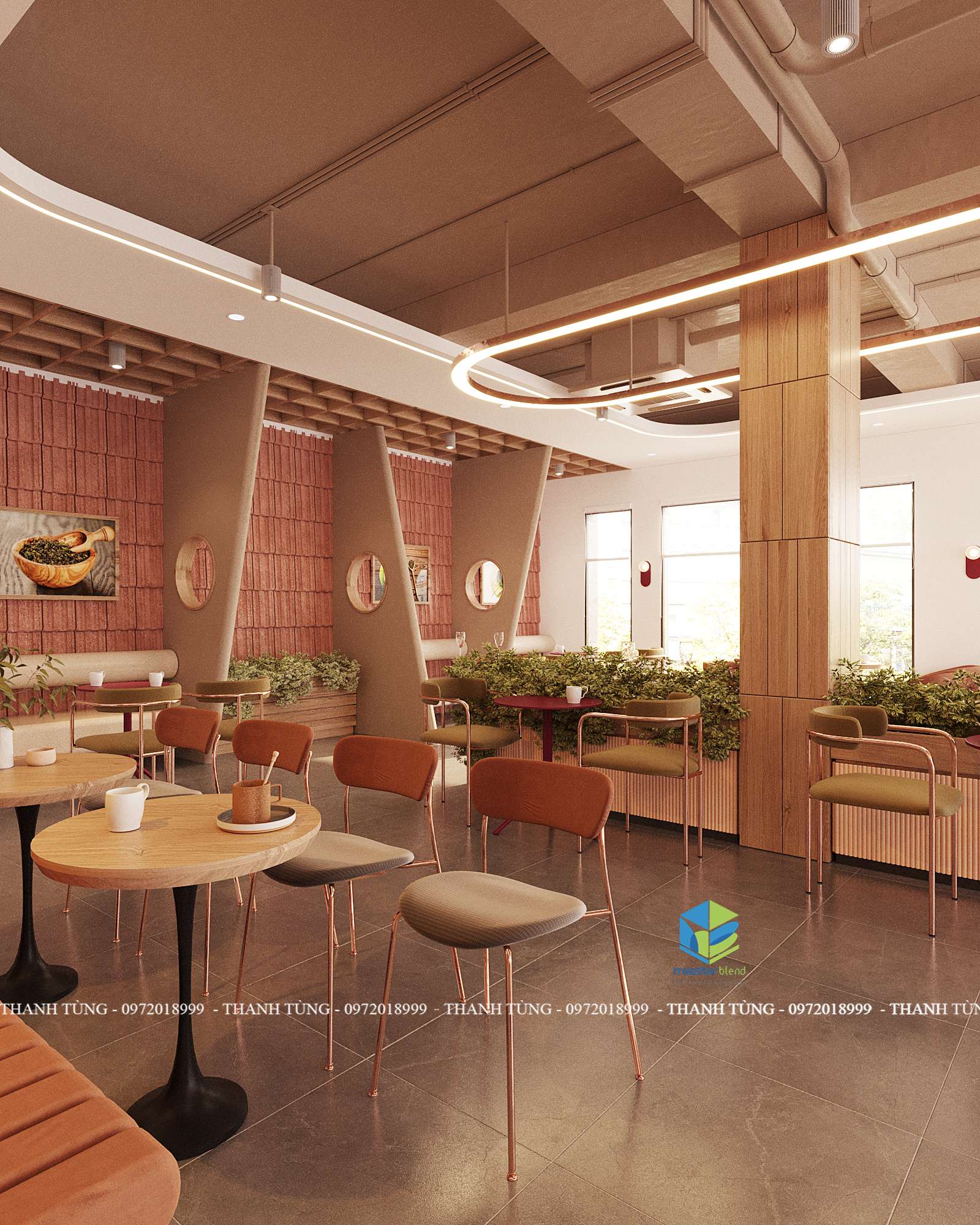 Thiết kế quán cafe & tea với thông điệp truyền tải những giá trị truyền thống. Trong đó, khu vực quầy kệ thể hiện rõ đặc trưng chất riêng của quán. Quầy order được thiết kế chuyên nghiệp với vân gỗ được bố trí gọn gàng. Kệ đồ và tủ bánh Menu được bố trí ở nơi dễ nhìn. Không gian bên trong quầy được thiết kế hợp lý, mang tới sự thuận tiện trong việc pha chế đồ uống … Hệ trần được decor vô cùng ấn tượng. Tạo nên một tổng thể hoàn hảo và cuốn hút.