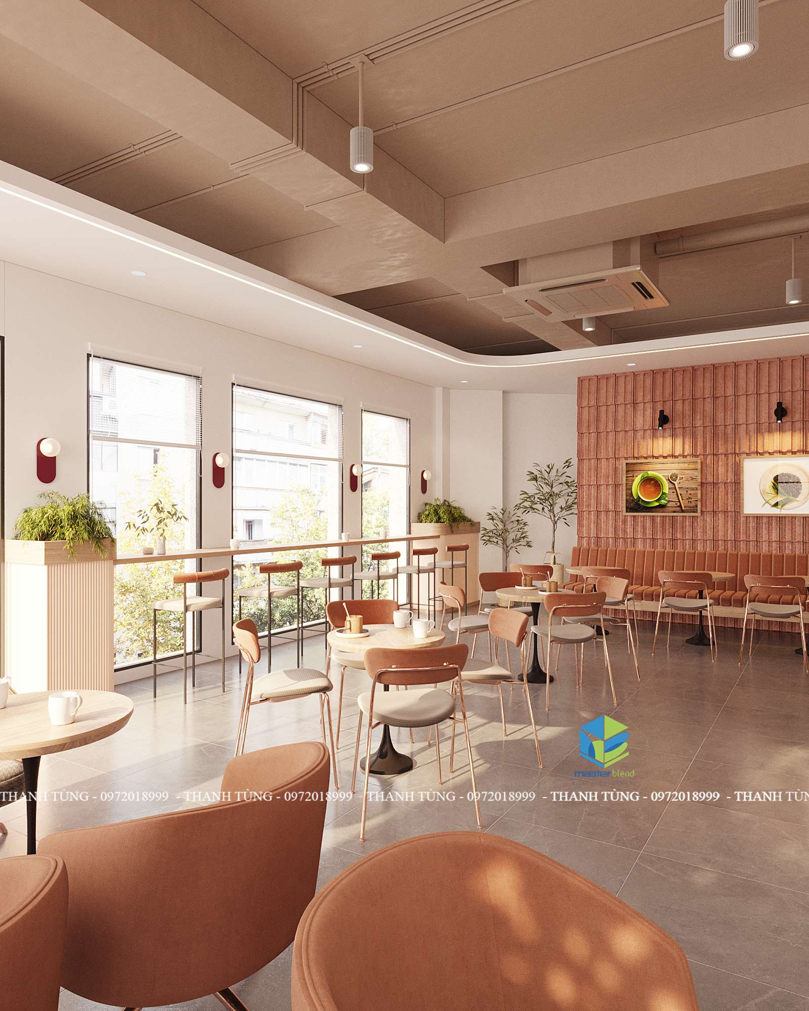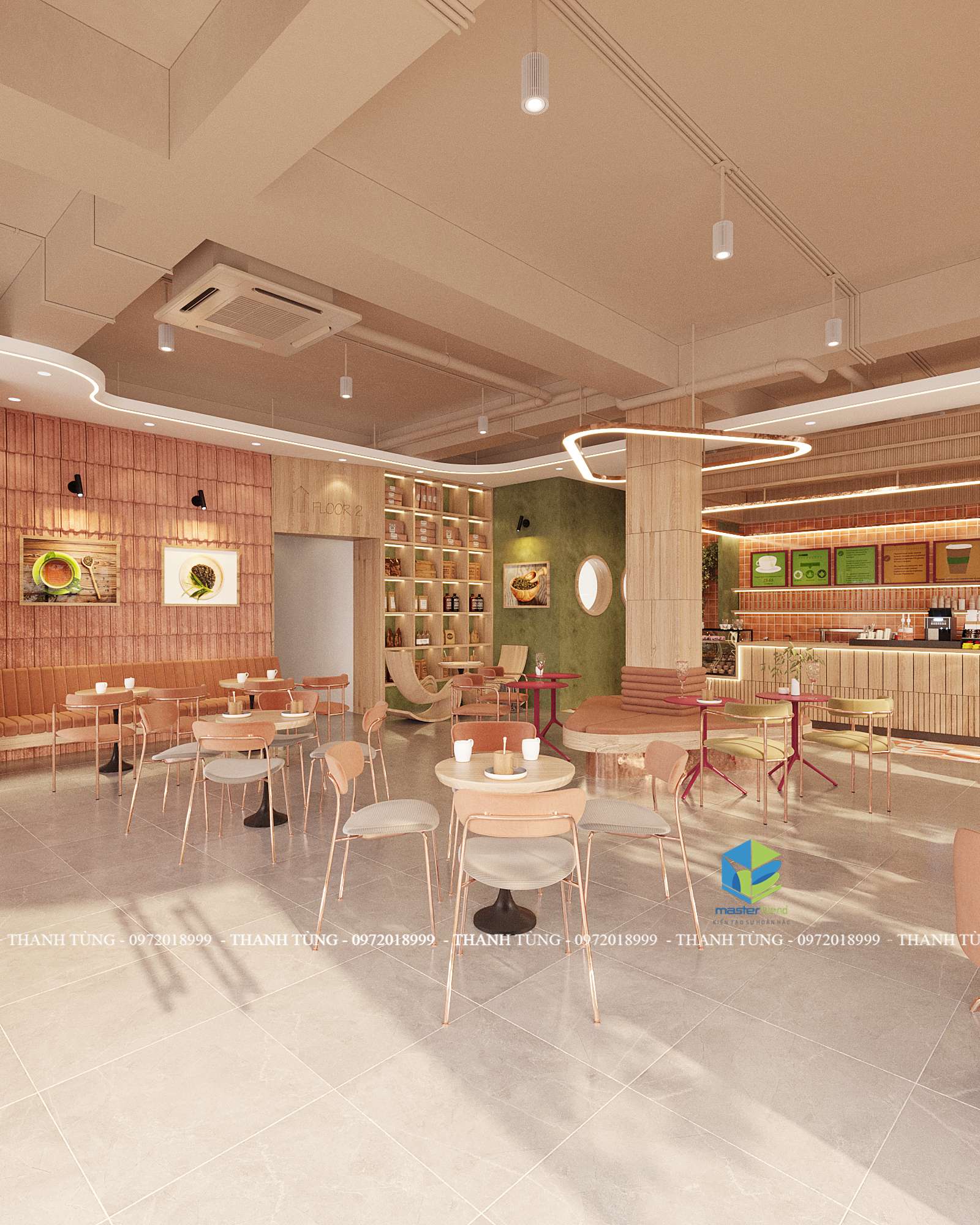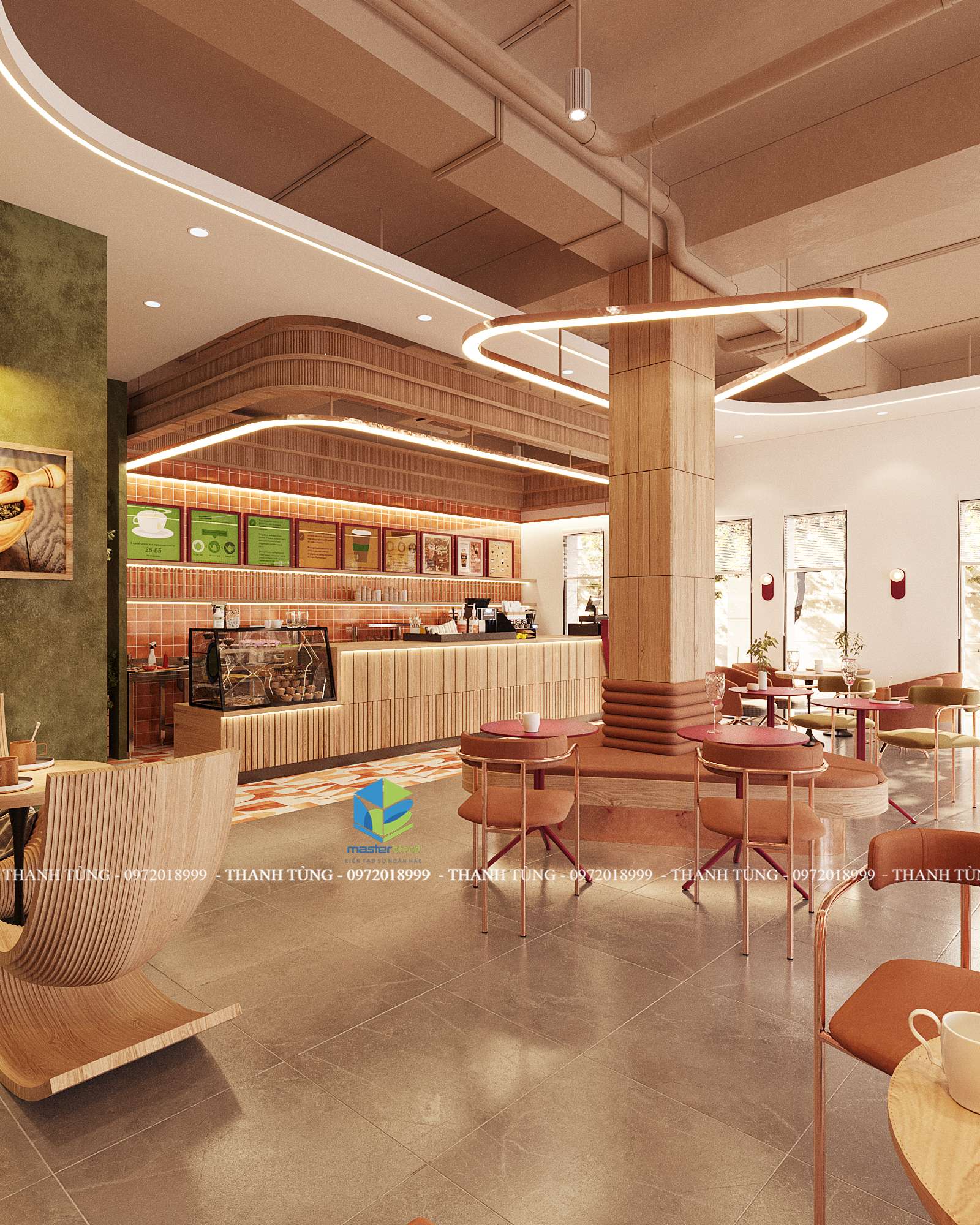 Thiết kế quán cafe & tea với thông điệp truyền tải những giá trị truyền thống. Trong đó, khu vực quầy kệ thể hiện rõ đặc trưng chất riêng của quán. Quầy order được thiết kế chuyên nghiệp với vân gỗ được bố trí gọn gàng. Kệ đồ và tủ bánh Menu được bố trí ở nơi dễ nhìn. Không gian bên trong quầy được thiết kế hợp lý, mang tới sự thuận tiện trong việc pha chế đồ uống … Hệ trần được decor vô cùng ấn tượng. Tạo nên một tổng thể hoàn hảo và cuốn hút.