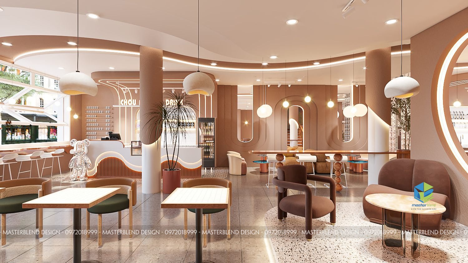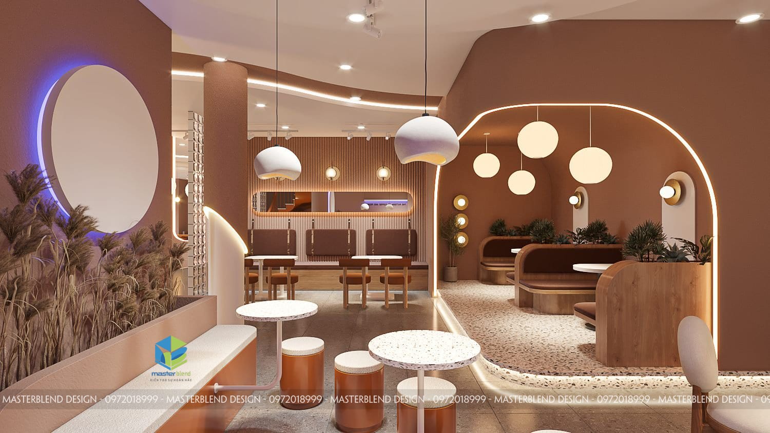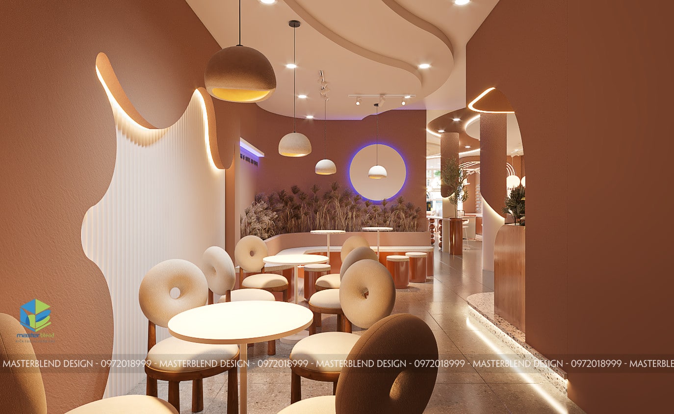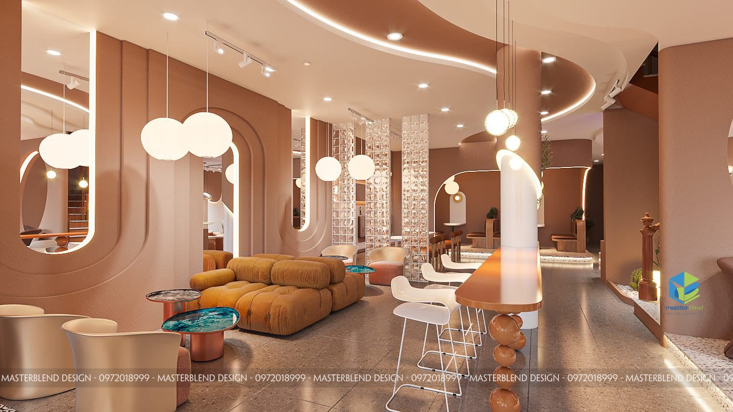 Hệ thổng trần được xử lý uốn lượn, giật cấp chuyển động rất bắt mắt. Cùng với đó là cả hệ tường quầy cũng là những đường cong hoàn hảo, những thước cột được nhấn nhá, kết hợp với ánh sáng và nội thất sang trọng . Tạo nên một tổng thể vô cùng hoàn mĩ, một điểm đến hấp dẫn thu hút , để khách hàng nhớ đến và ở lại quán lâu hơn…