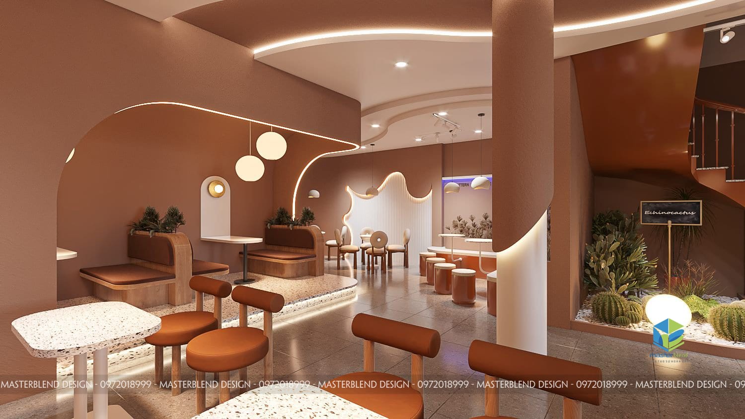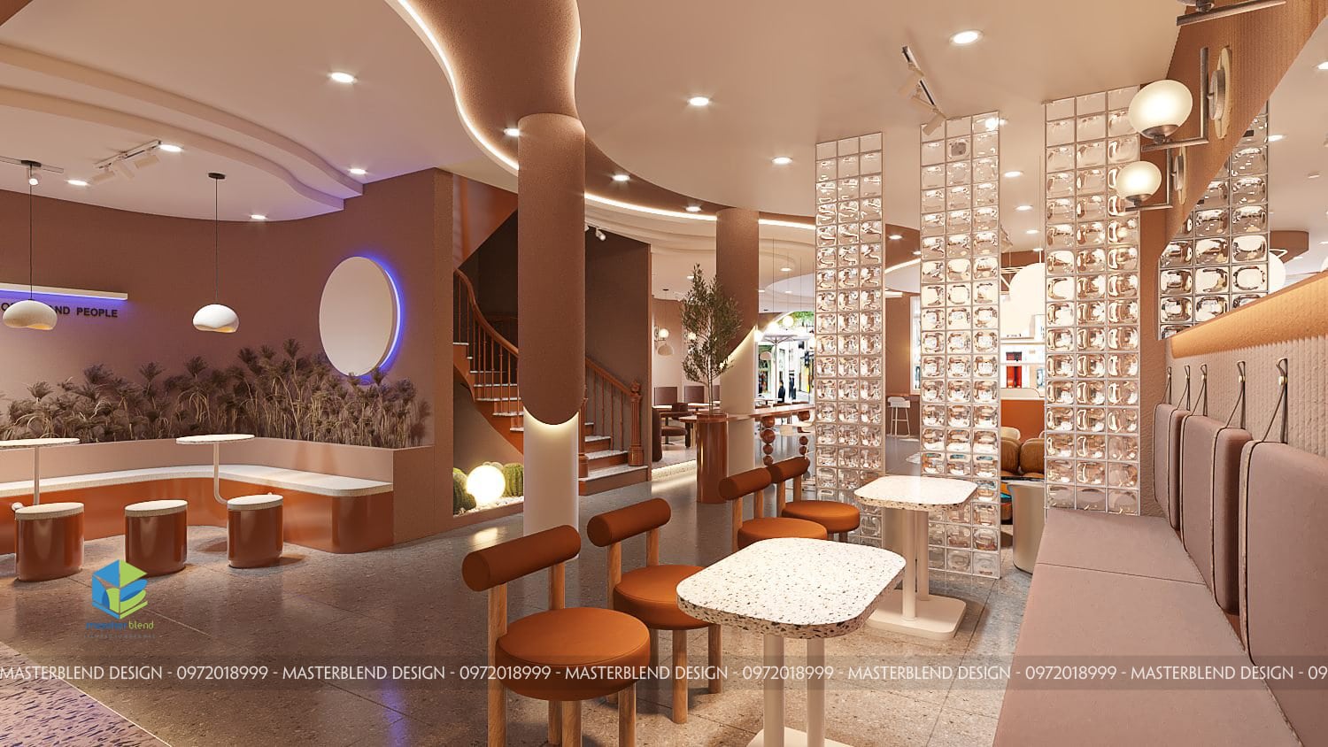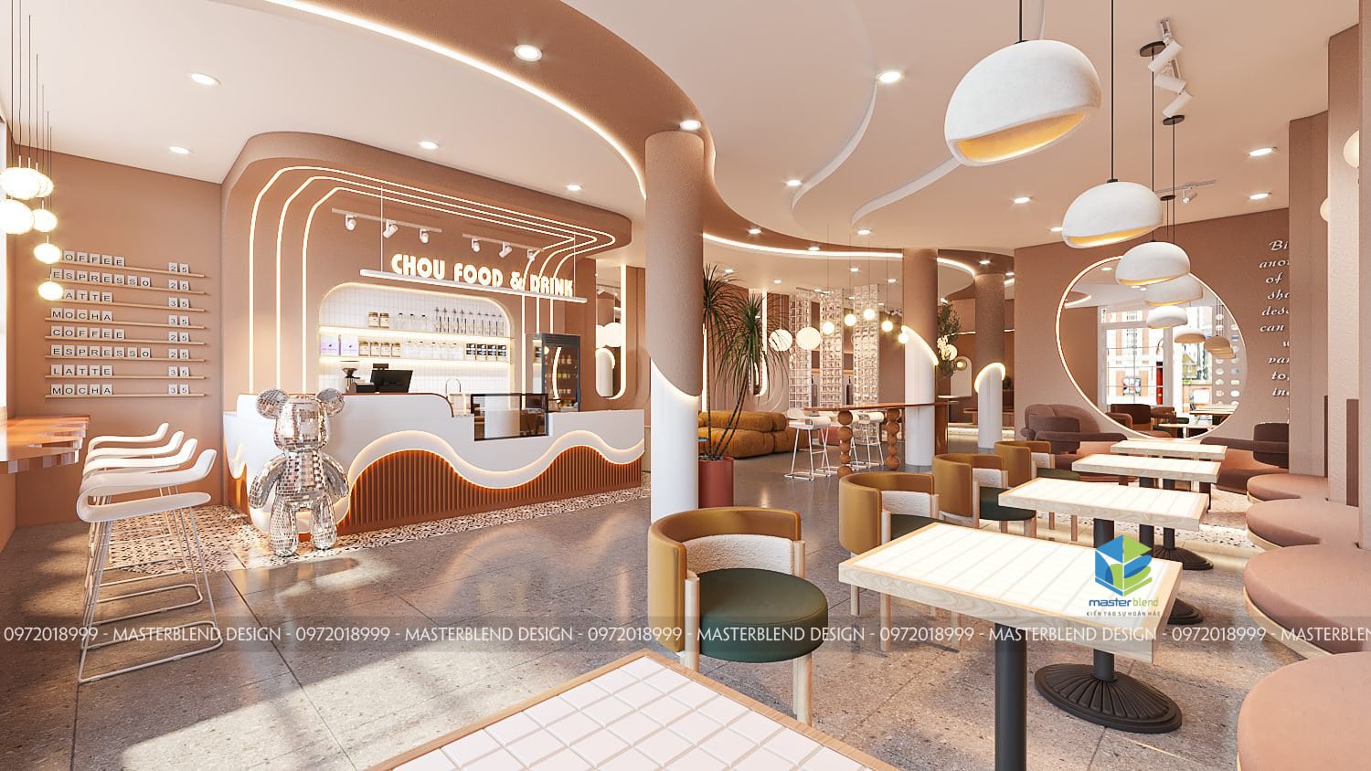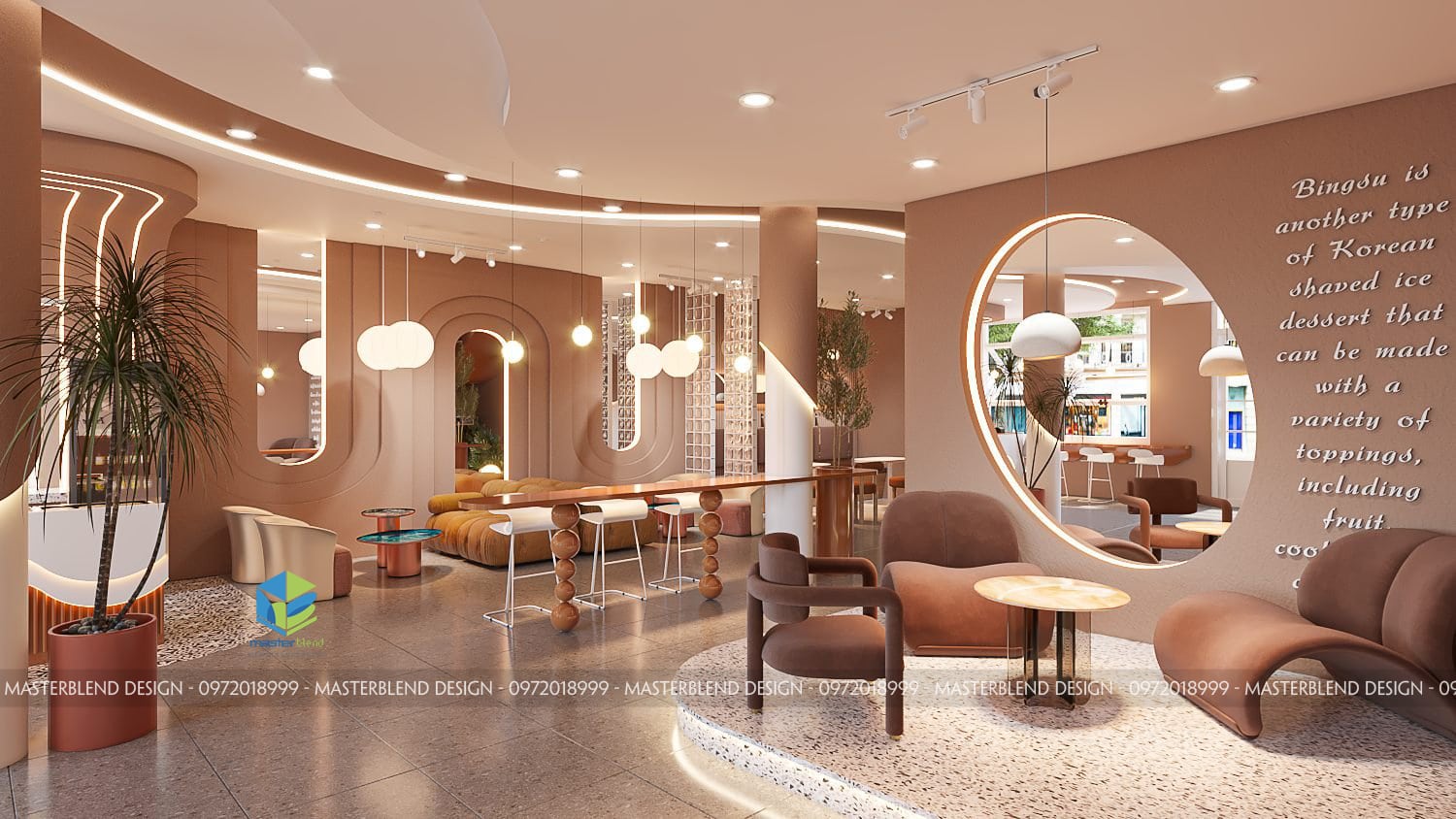 Hệ thổng trần được xử lý uốn lượn, giật cấp chuyển động rất bắt mắt. Cùng với đó là cả hệ tường quầy cũng là những đường cong hoàn hảo, những thước cột được nhấn nhá, kết hợp với ánh sáng và nội thất sang trọng . Tạo nên một tổng thể vô cùng hoàn mĩ, một điểm đến hấp dẫn thu hút , để khách hàng nhớ đến và ở lại quán lâu hơn…