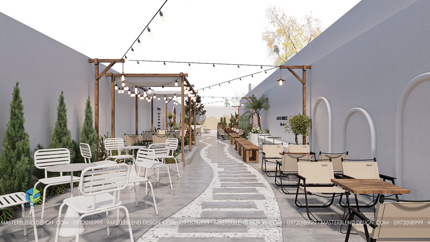 Dọc theo lối đi là con đường uốn lượn lát đá mài kết hợp sỏi trắng, dẫn lối vào từng khu vực bàn ghế nhỏ bên ngoài. Đường cong mềm mại này tạo nên sự thư thái và khác biệt so với các layout đường thẳng công nghiệp.