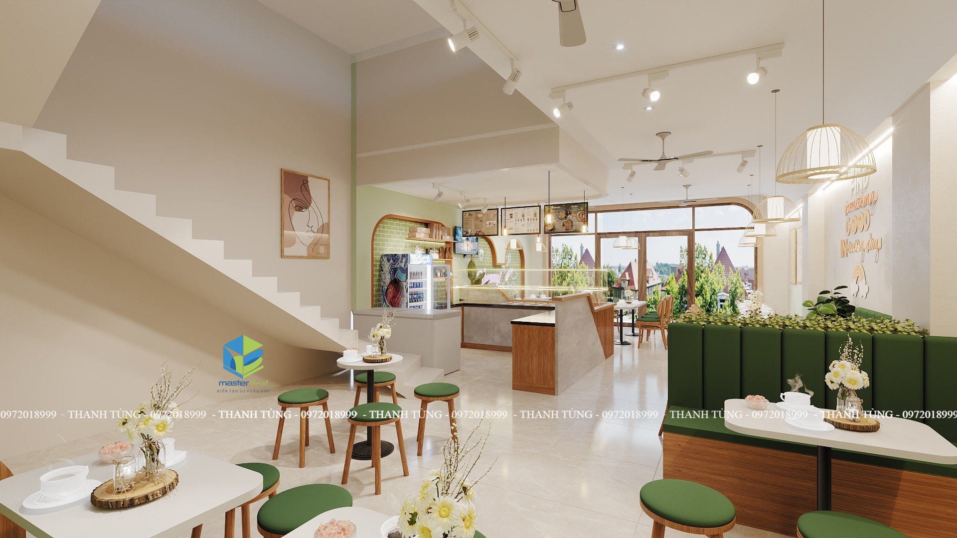 Bên trong nội thất được bài trí với tông màu xanh mát và màu gỗ, kết hợp với màu trắng sáng tạo nên một tổng thể hài hoà gần gũi với thiên nhiên và nét riêng độc đáo của quán …