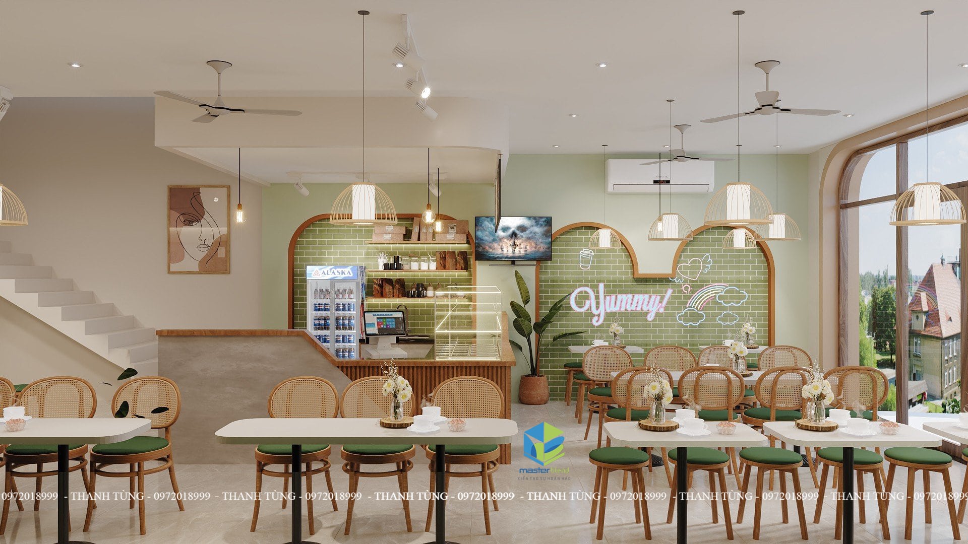 Hệ trần được làm bằng thạch cao có bố trí đèn hắt trang trí và đèn thả mây decor, hệ quạt phân chia phù hợp cho từng khu vực. Hệ tường được nhấn nhá bởi vách thạch cao hệ vòm, những bức tranh tường, hệ chữ nổi decor, chữ logo quán nổi bật và hiện đại …