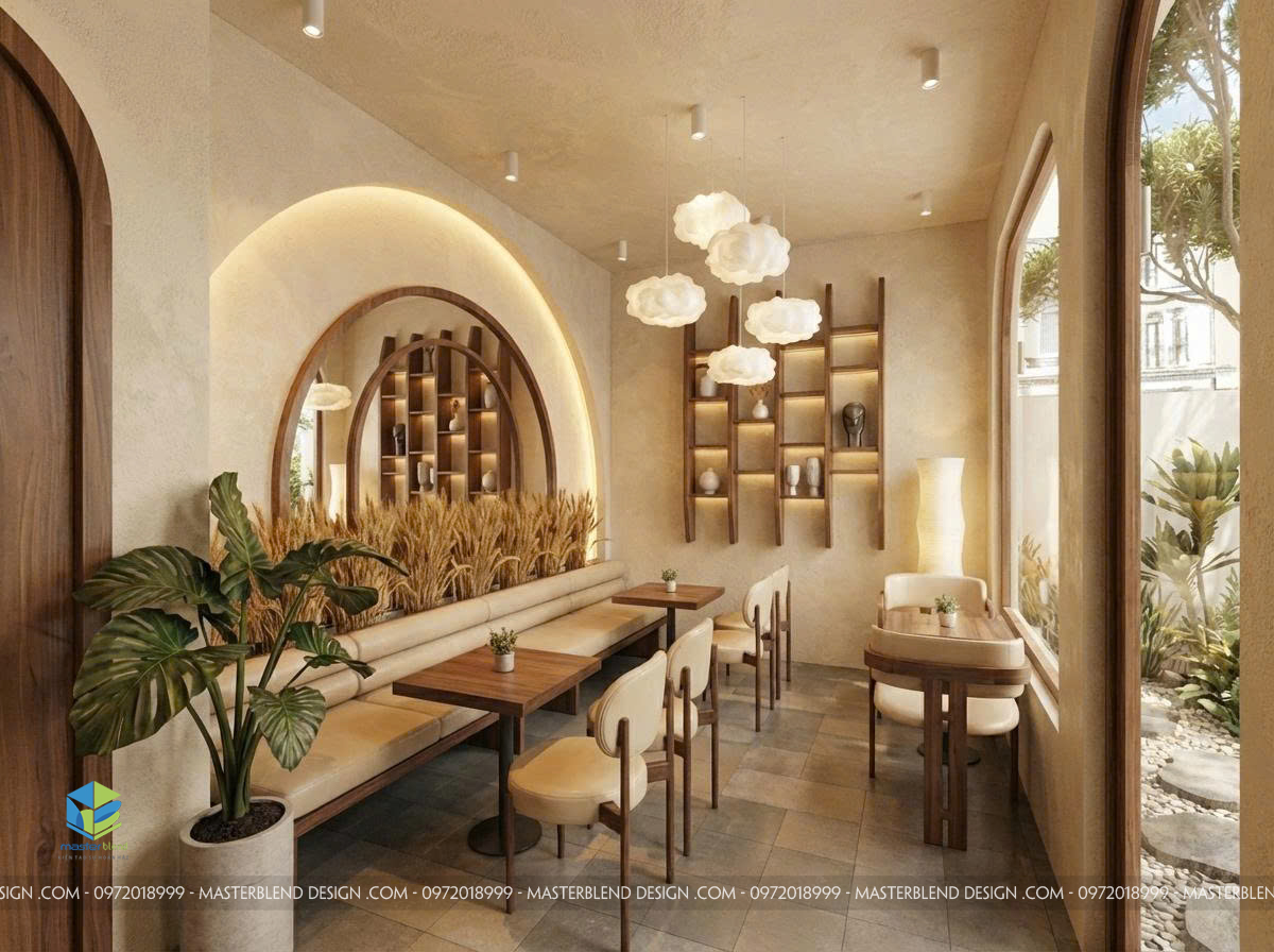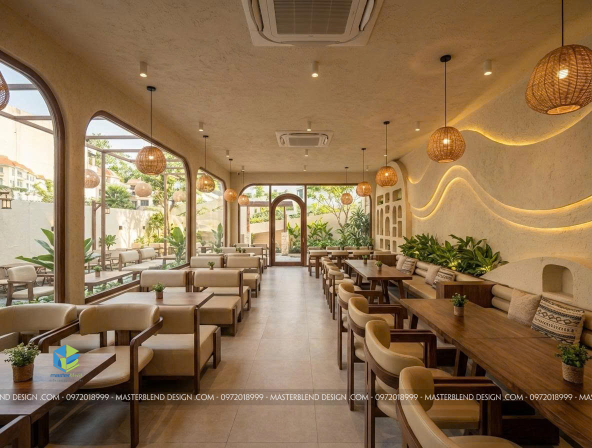 Không gian bên trong được chia thành: Khu bàn đôi – bàn nhóm nhỏ , khu sofa dài sát tường, khu gần cửa kính view sân vườn, khu trung tâm linh hoạt
