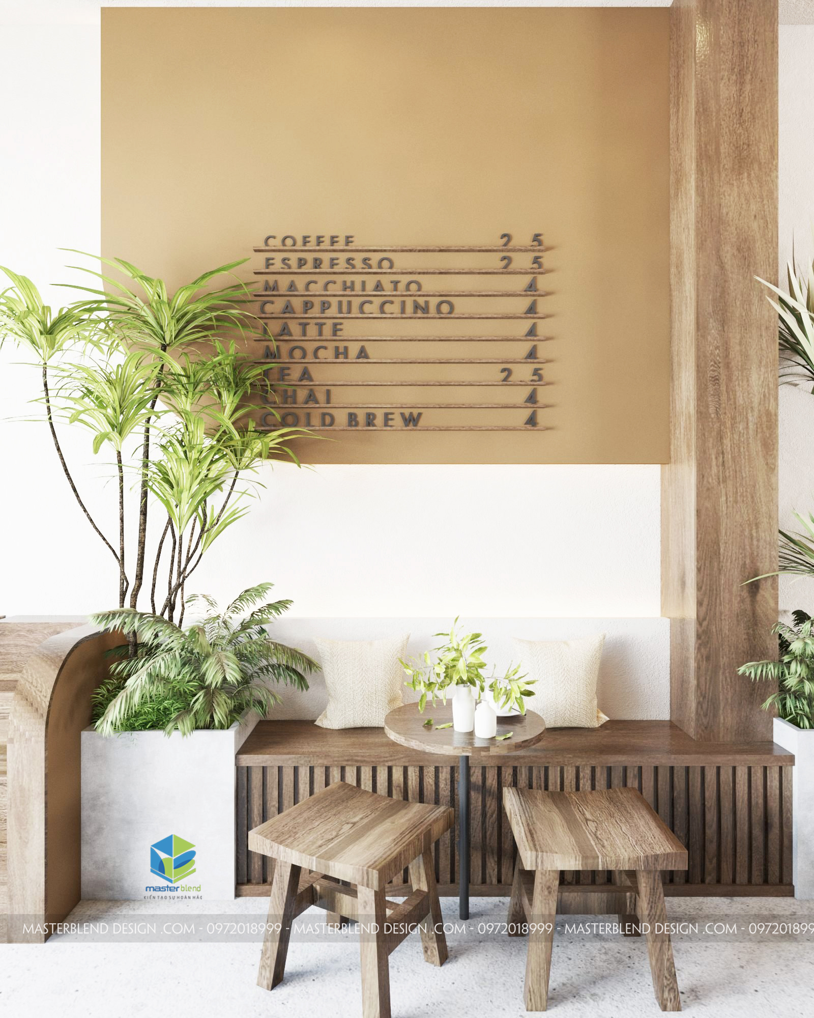 Không gian quán sử dụng nhiều cây xanh trang trí ở các góc tường, bàn ghế và quầy pha chế. Cây xanh không chỉ đóng vai trò trang trí mà còn giúp thanh lọc không khí, mang lại sự tươi mát và cảm giác gần gũi với thiên nhiên. Sự kết hợp hài hòa giữa cây xanh và các yếu tố nội thất bằng gỗ tạo nên một không gian vừa hiện đại, vừa tự nhiên, thích hợp cho khách hàng muốn thư giãn và trò chuyện.