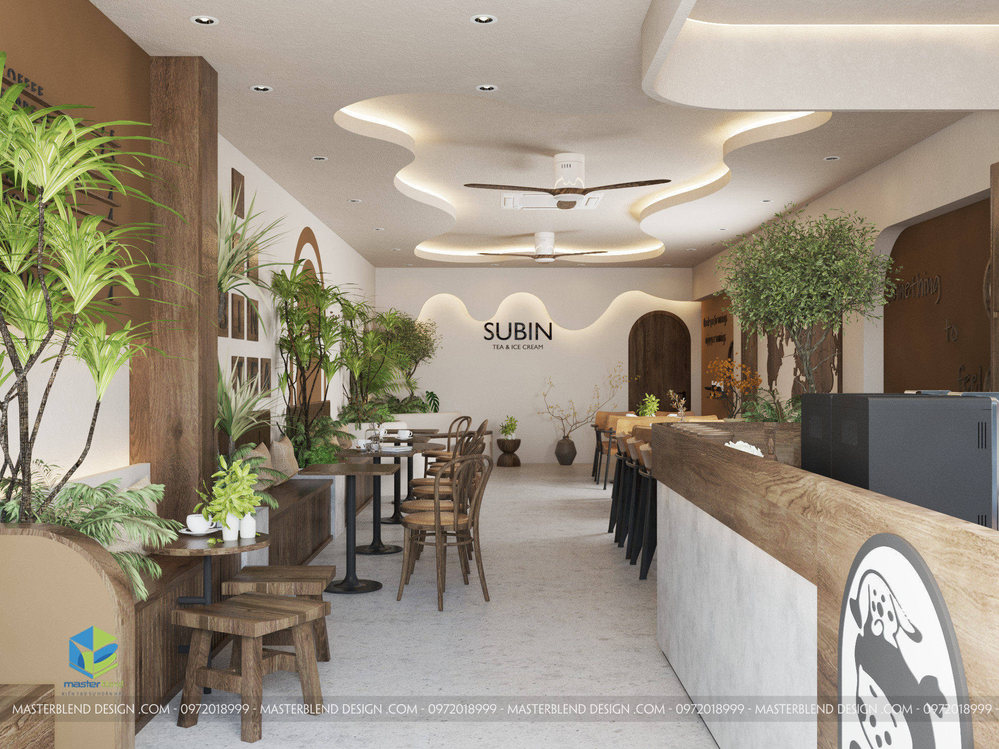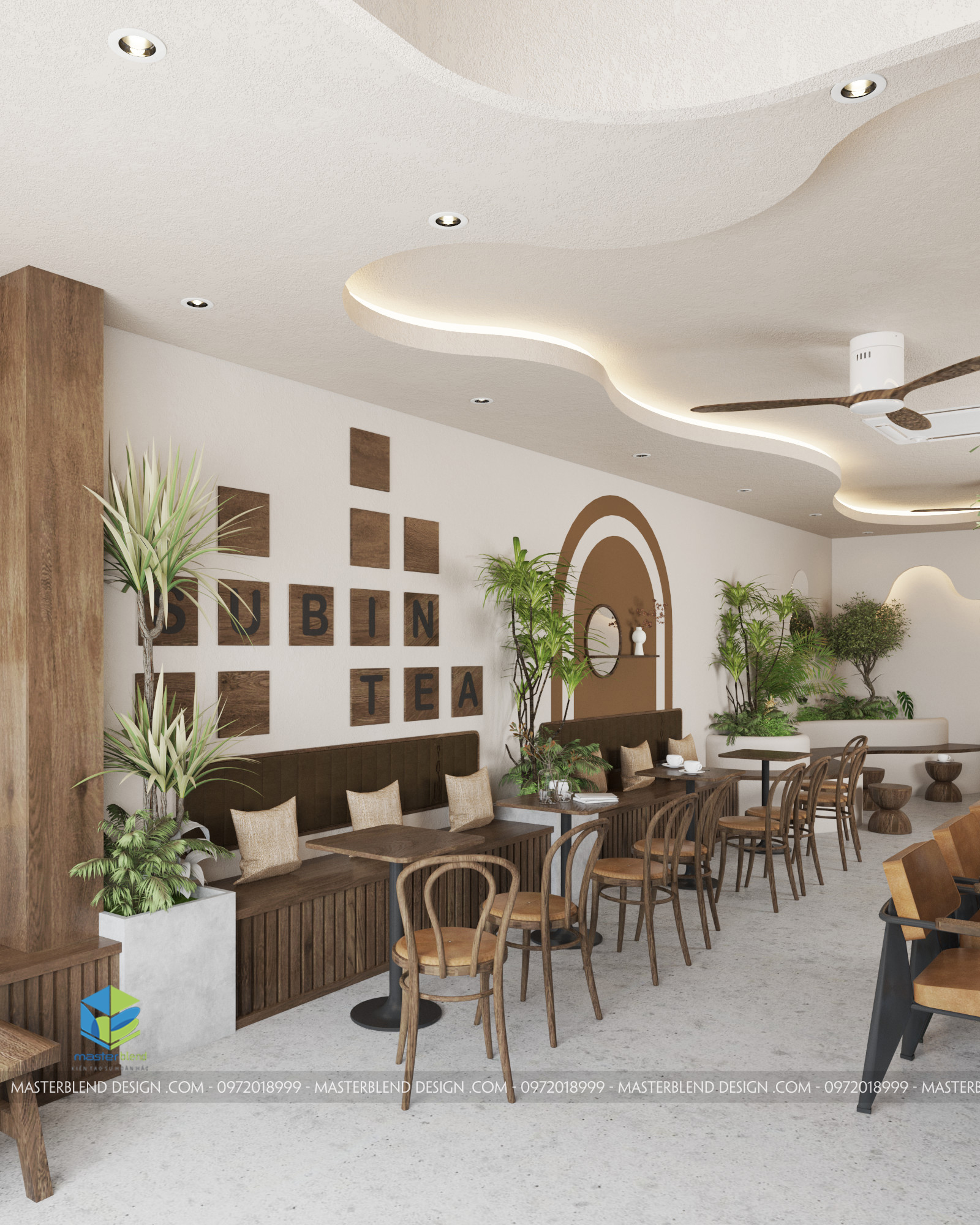 Bước vào bên trong, khách hàng sẽ cảm nhận được sự ấm áp và thư giãn với cách bố trí tinh tế của quán. Không gian sử dụng tông màu nâu gỗ tự nhiên kết hợp với màu trắng chủ đạo, tạo nên sự hài hòa và gần gũi. Trần nhà được thiết kế với các đường cong mềm mại và đèn LED chiếu sáng tạo nên những điểm nhấn nhẹ nhàng nhưng hiện đại, tạo ra chiều sâu và sự sinh động cho không gian.
