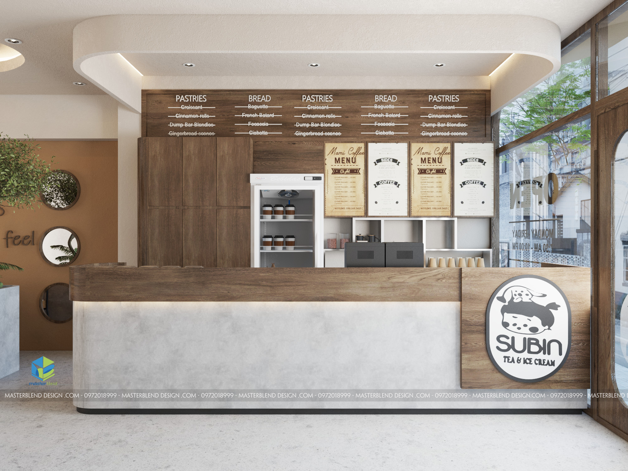 Mặt trước của quầy trang trí logo Subin Tea & Ice Cream với kích thước lớn, giúp khách hàng dễ dàng nhận diện thương hiệu. Phía sau quầy pha chế là bức tường trang trí bằng gỗ với bảng menu rõ ràng, hiển thị các loại bánh ngọt, bánh mì và menu đồ uống của quán. Điều này giúp khách hàng dễ dàng lựa chọn món ngay khi bước vào.
