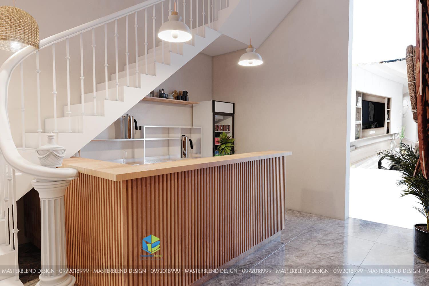 Tầng 1 được bố trí bàn ghế sát tường cho không gian thêm rộng rãi , quầy pha chế được thiết kế bên trong tận dụng khu cầu thang mà vẫn đầy đủ công năng…
