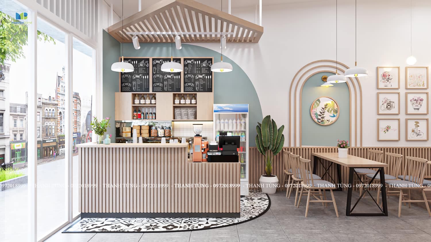 Khu quầy lễ tân được thiết kế bên ngoài , thuận tiện cho việc tiếp đón và or cho khách hàng các dịch vụ của quán. Thiết kế quầy rất bắt mắt với trần cách điệu hình mái nhà , quầy gỗ dạng nan và sàn được nhấn gạch bông hình vòng cung , tạo cho quầy một điểm nhấn nổi bật , hấp dẫn.