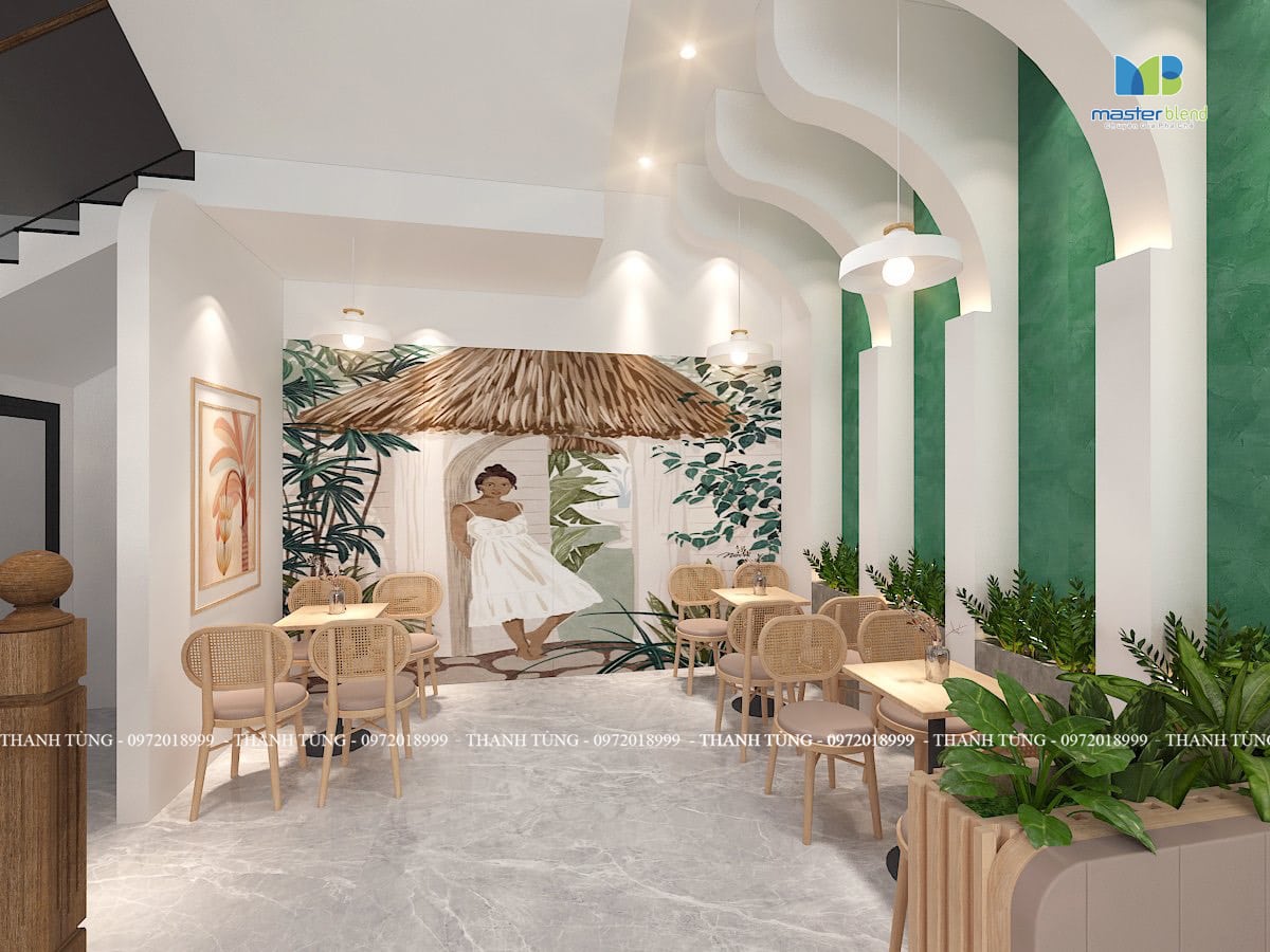 Thiết kế với tông màu xanh chủ đạo và màu vàng nâu của gỗ tự nhiên , tạo dấu ấn riêng của thương hiệu, một không gian xanh mát vừa sang trọng vừa gần gũi với con người, rất thích hợp cho không gian thưởng thức trà và thư giãn