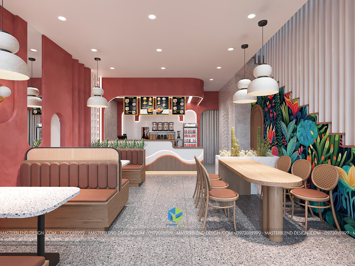 Tổng thể, thiết kế của tiệm mì cay mang phong cách hiện đại, sáng tạo nhưng vẫn giữ được sự ấm cúng, gần gũi, rất phù hợp để thu hút khách hàng tại Hà Nội.