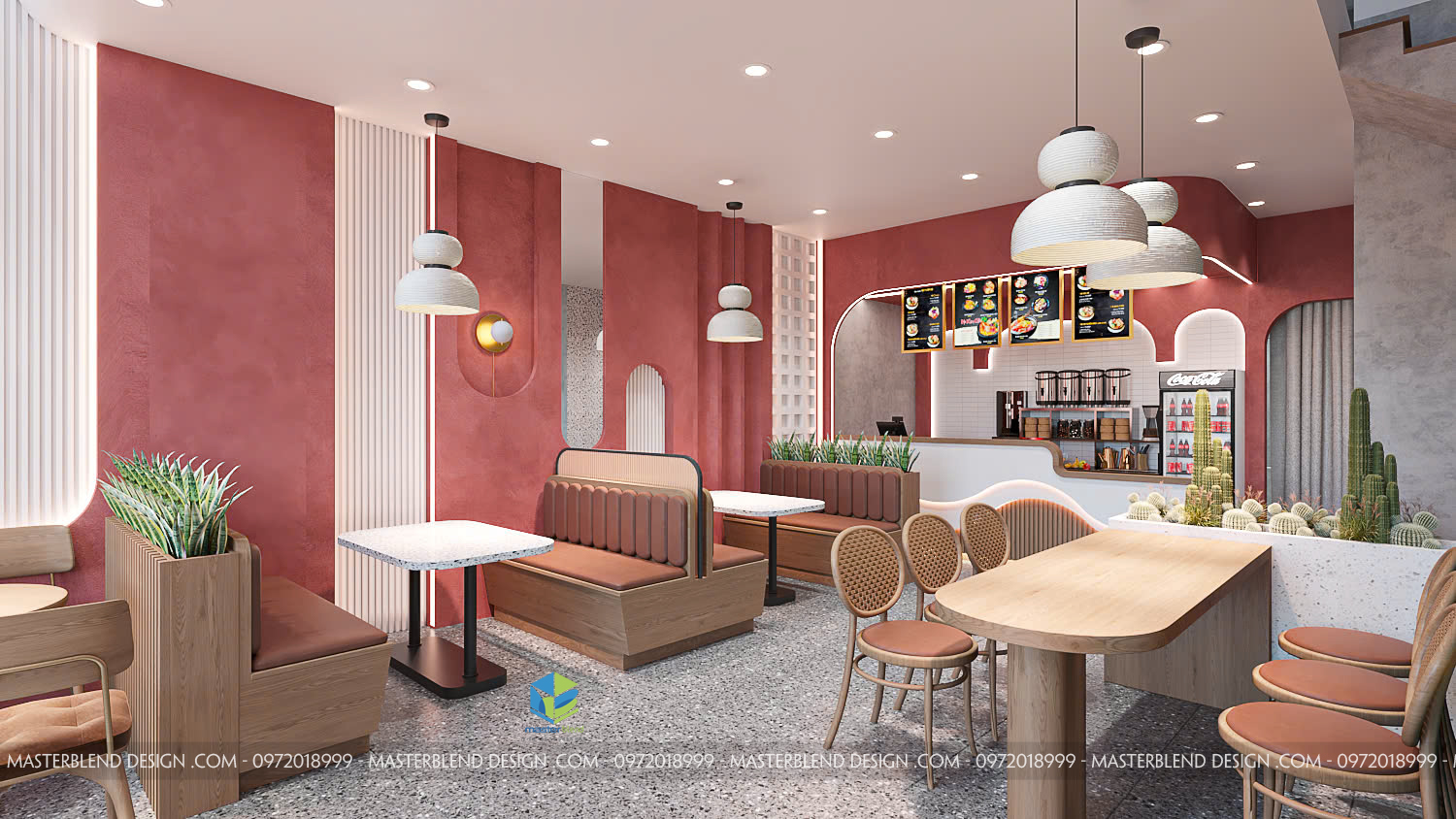 Không gian chính: Nội thất được bố trí hài hòa với tông màu chủ đạo là đỏ gạch nhạt và trắng, tạo ra sự ấm cúng và thoải mái cho khách hàng. Bên trong, các bàn ghế được sắp xếp hợp lý, có sự pha trộn giữa các bàn nhỏ dành cho nhóm ít người và bàn dài cho nhóm đông. Ghế ngồi được thiết kế với tông màu gỗ và đệm lót êm ái.