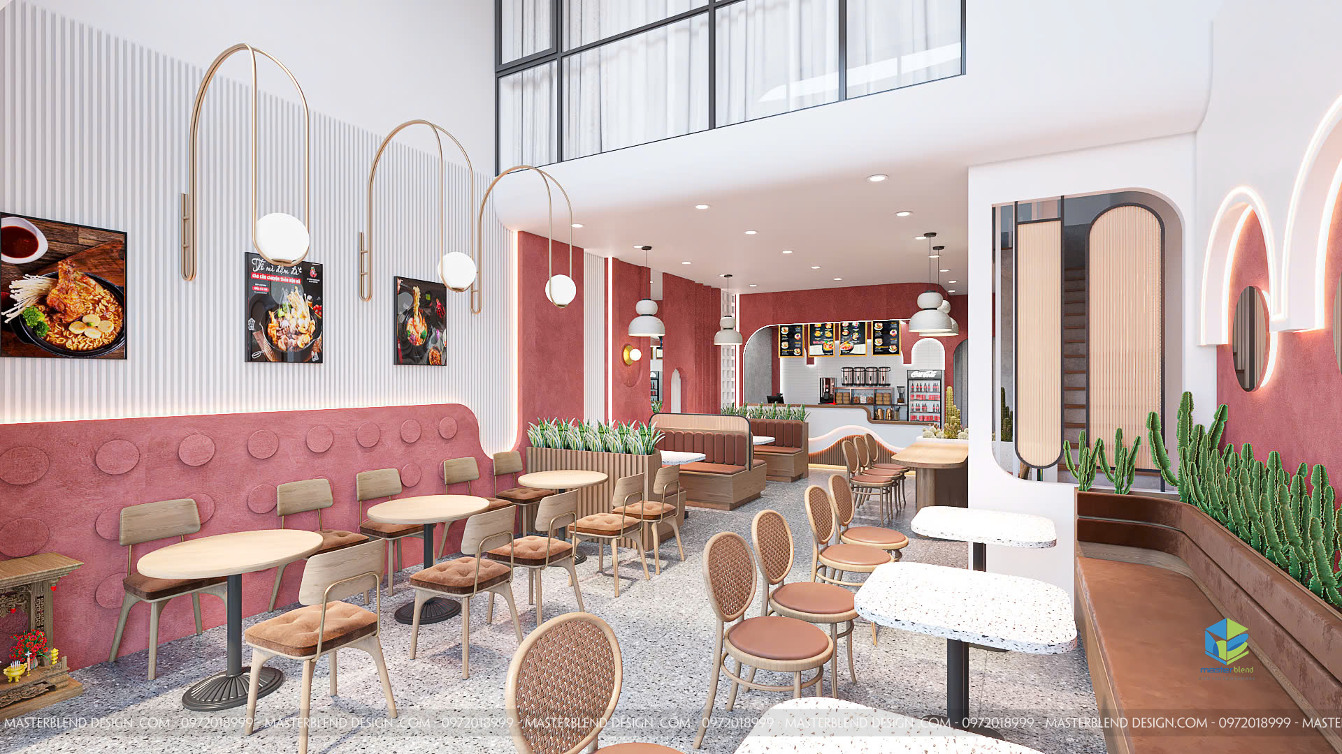 Khu vực quầy: Phía sau là quầy phục vụ được thiết kế hiện đại, với màn hình menu hiển thị các món ăn. Quầy có hình dạng uốn lượn và màu trắng sạch sẽ, kết hợp với các đèn treo và cây xanh trang trí, tạo cảm giác thân thiện và dễ chịu.
