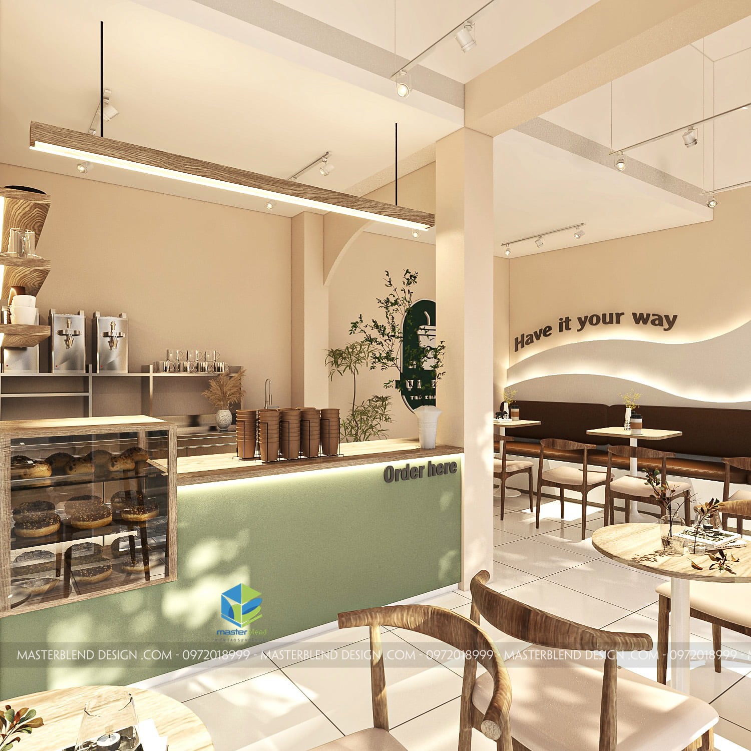 Ngay khi bước vào quán, bạn sẽ bị cuốn hút bởi quầy order nổi bật với gam màu xanh pastel nhẹ nhàng, kết hợp cùng hệ thống ánh sáng đèn led hiện đại. Quầy order không chỉ là nơi khách hàng gọi đồ mà còn là điểm nhấn thẩm mỹ, với các kệ trưng bày gọn gàng, đầy ấn tượng. Những vật dụng trang trí và cốc chén được sắp xếp tỉ mỉ, tạo nên một không gian ngăn nắp và thân thiện.
