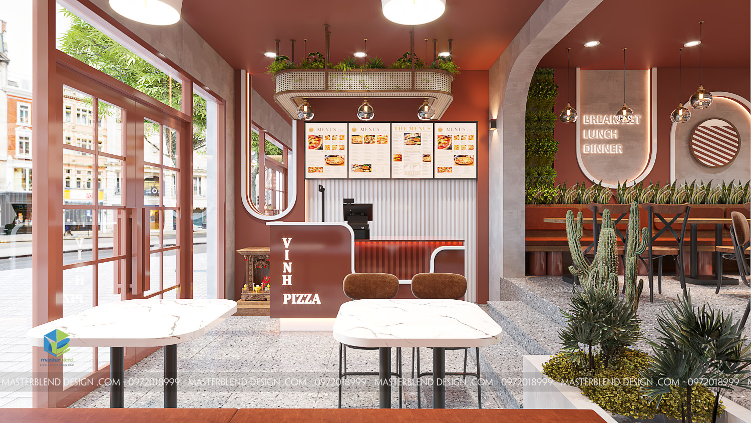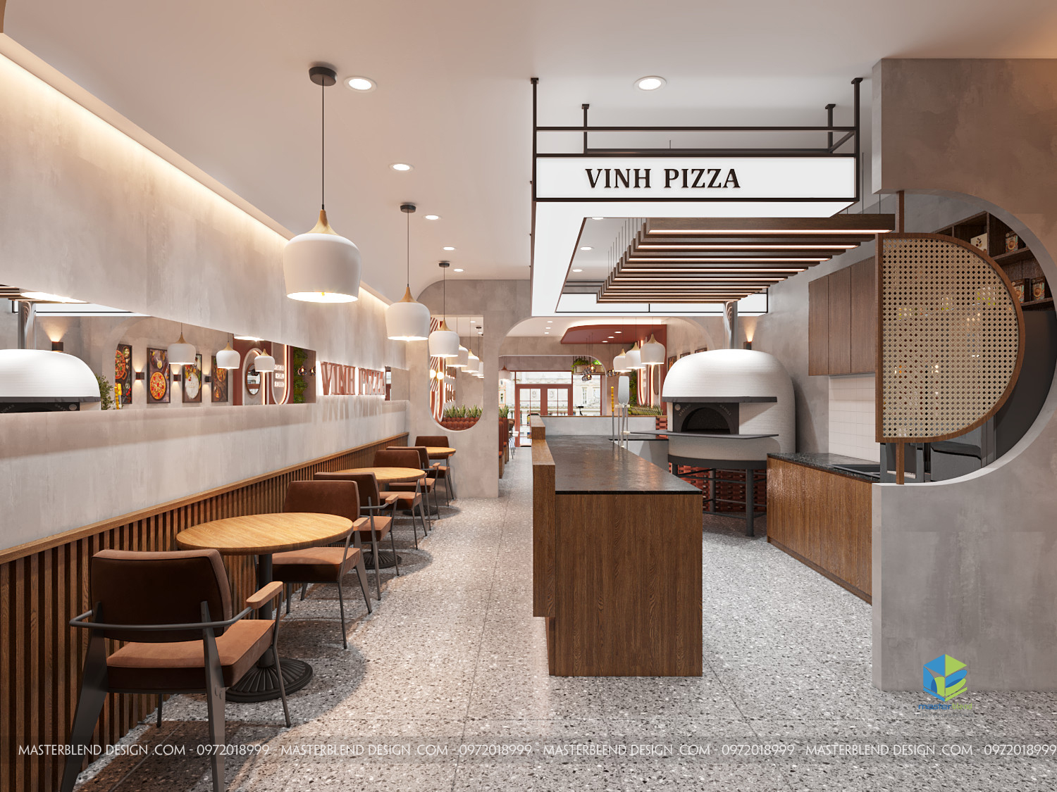 Không gian nội thất của Vinh Pizza được chăm chút tỉ mỉ với những đường nét thiết kế đơn giản nhưng mạnh mẽ, mang lại cảm giác hiện đại. Các đường thẳng và hình khối trong không gian, từ bàn ghế, quầy thu ngân cho đến hệ thống trần, tường đều tuân theo phong cách tối giản, giúp tối ưu không gian sử dụng và tạo ra sự gọn gàng, ngăn nắp. Các góc cạnh vuông vắn cùng các chi tiết bo tròn nhẹ nhàng trong các khung cửa và đèn trần tạo sự cân bằng giữa mạnh mẽ và mềm mại.