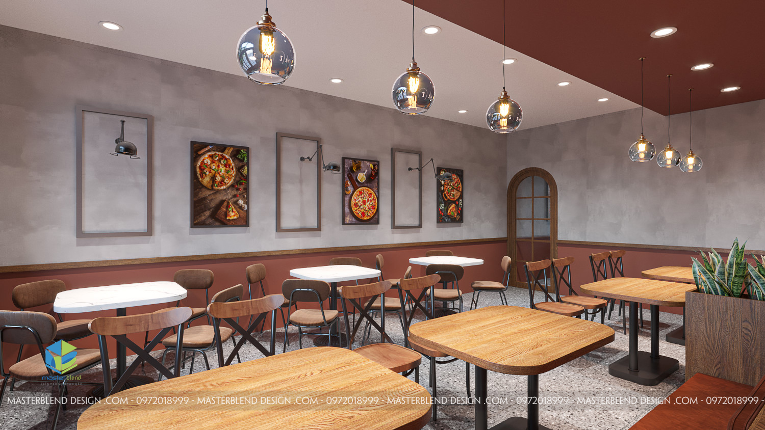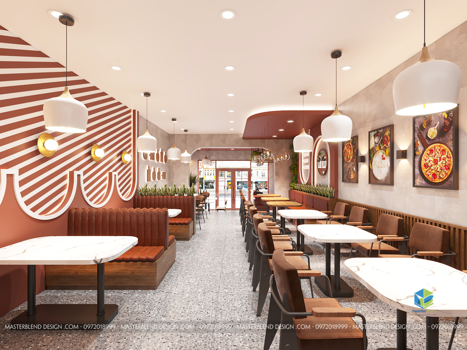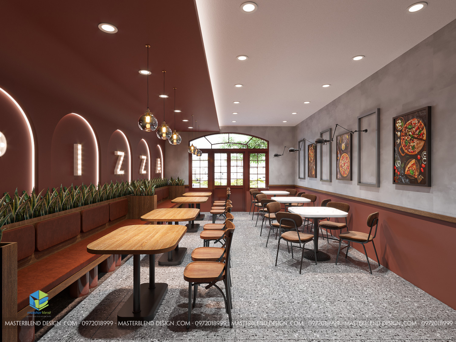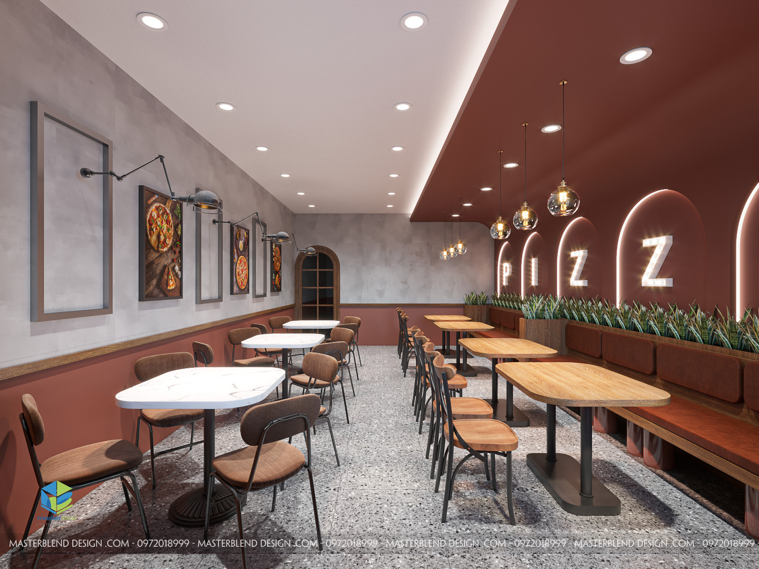 Đèn thả và đèn tường cung cấp ánh sáng ấm áp cho không gian. Logo “PIZZA” được làm nổi bật bằng đèn chiếu sáng. Tường được sơn màu đỏ tươi và trang trí bằng các bức tranh về pizza, tạo điểm nhấn và làm cho không gian trở nên sinh động hơn.