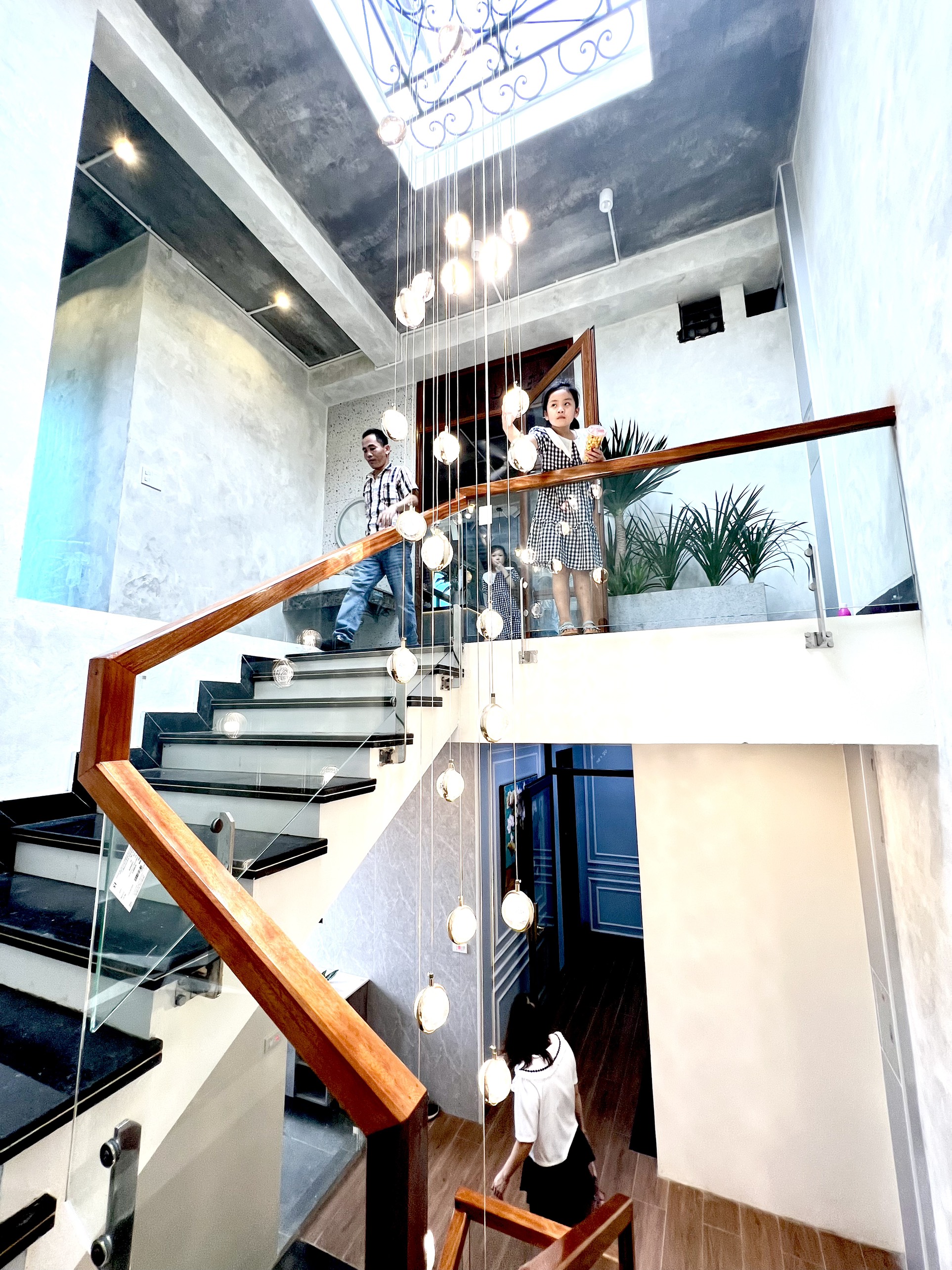 Tới Không gian cafe đầu tiên ta được chào đón bởi ánh sáng của giếng trời cùng những chiếc đèn chùm rất rực rỡ và nghệ thuật. Cửa ra vào được làm hệ cửa gỗ kính có logo rất sang trọng. Những chậu cây decor làm xanh thêm không gian của cửa hàng …