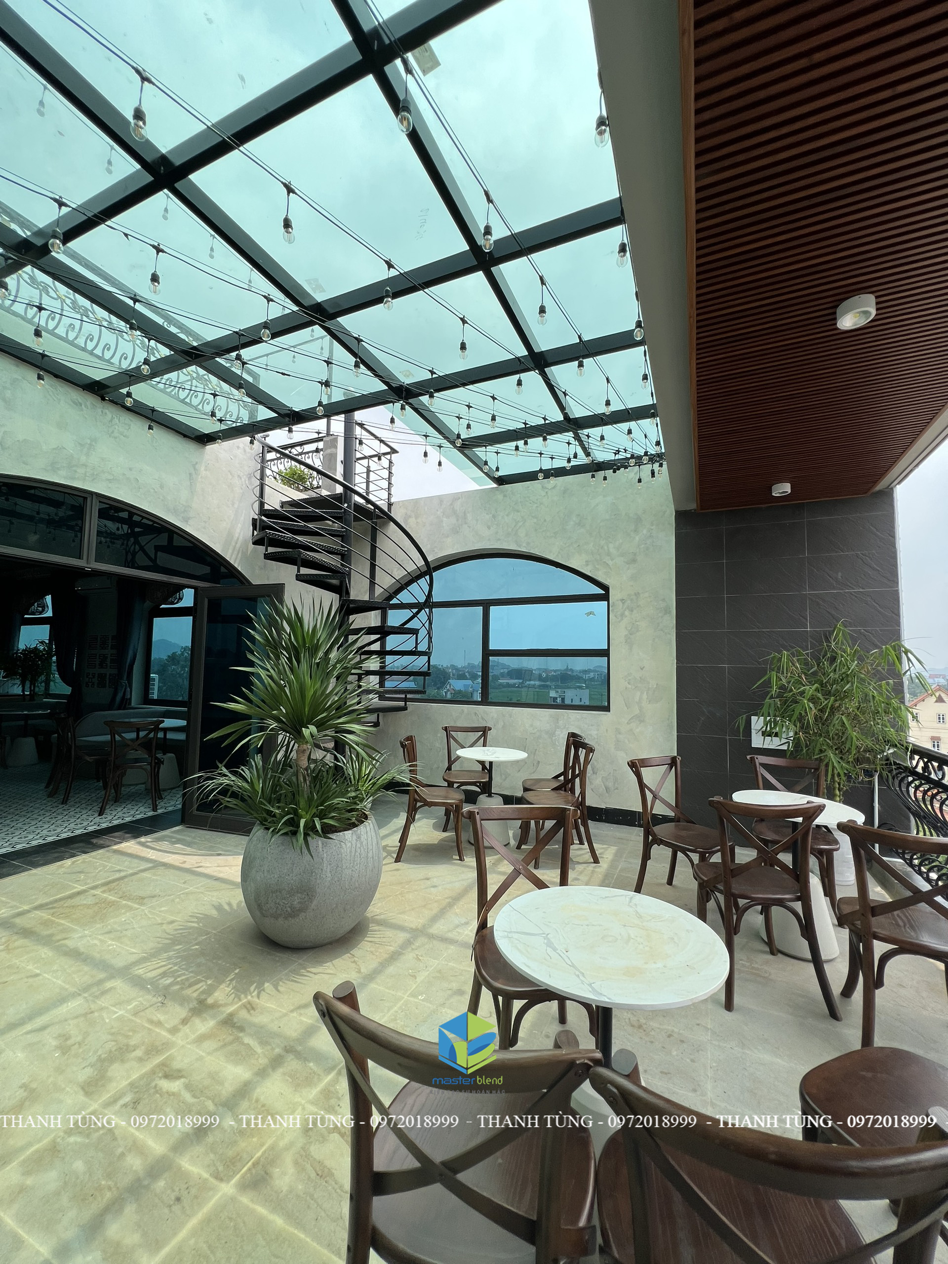 Khu ngoài có mái che được thiết kế làm kính cường lực với hệ khung sắt, bên ngoài được nhấn nhá bởi hệ trần đan nan và đèn trang trí rất nghệ thuật và cuốn hút. Thực khách có thể tới đây thưởng thức những ly cafe thơm ngon và tận hưởng không khí tự nhiên và ngắm nhìn thiên nhiên mây trời …
