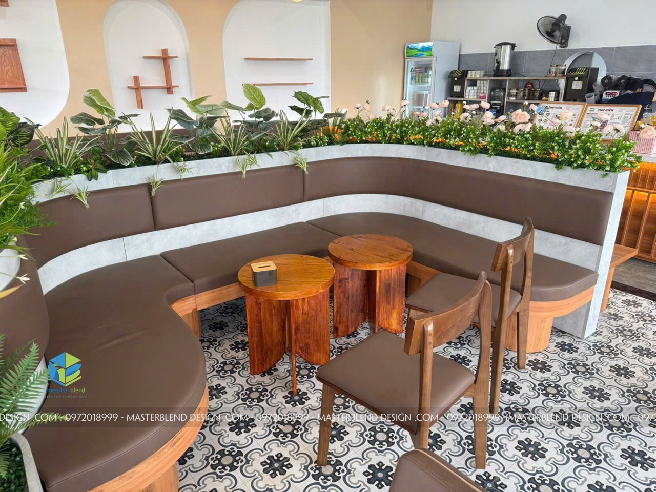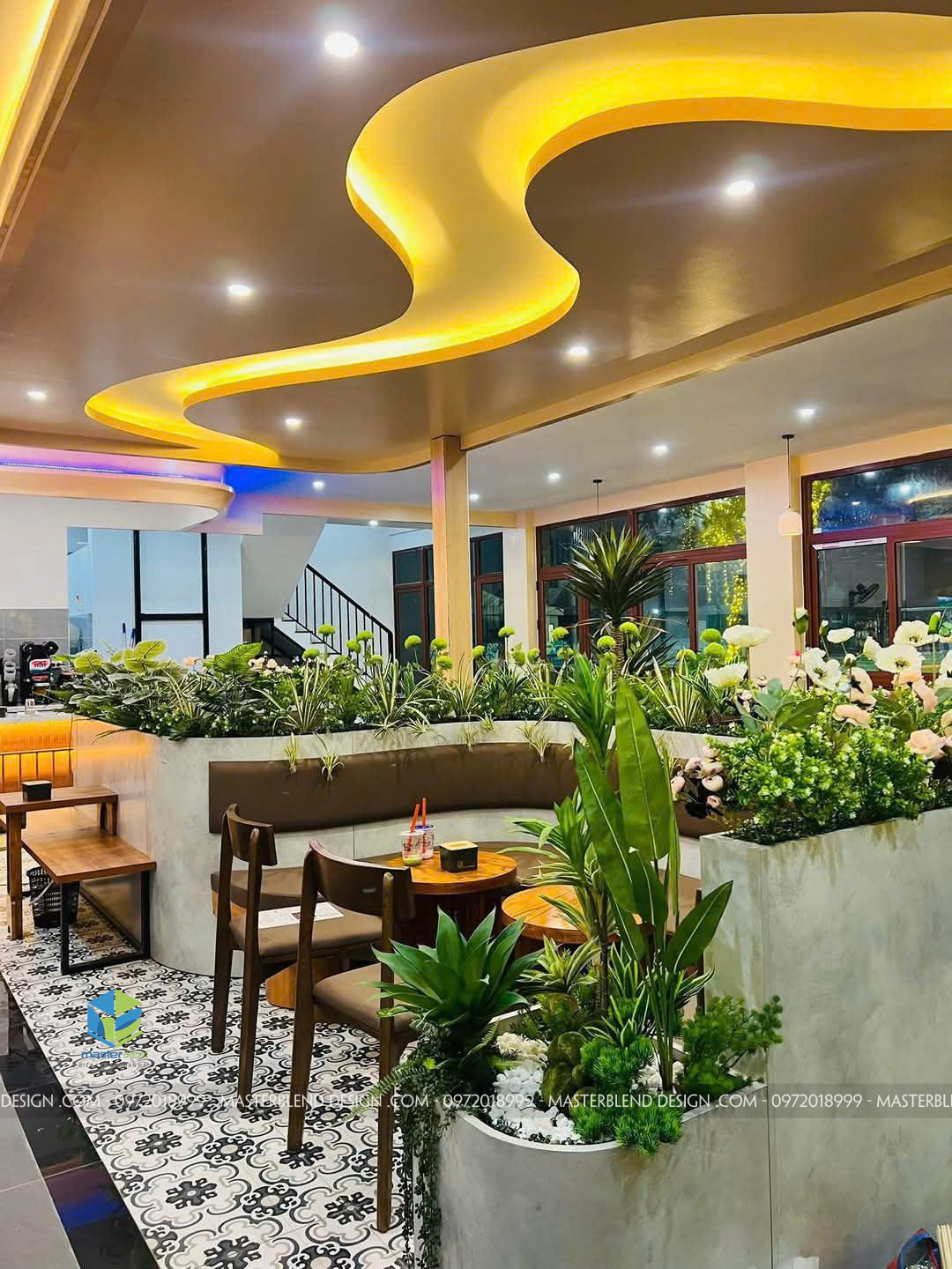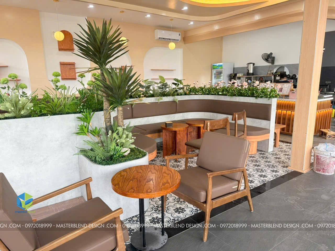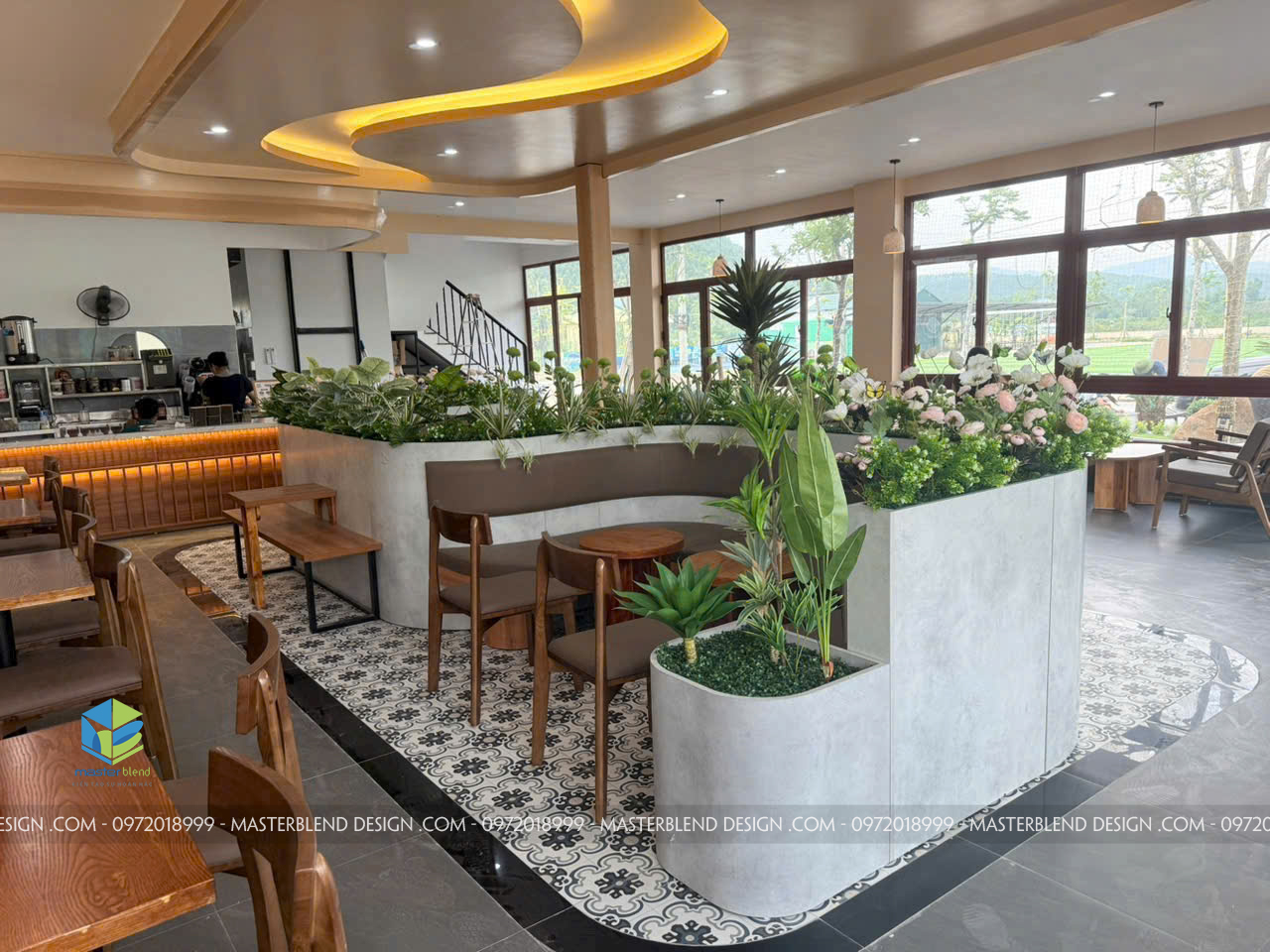 • Thiết kế bồn cây bo cong lớn tại trung tâm quán, tạo phân khu tự nhiên mà không cần vách ngăn.