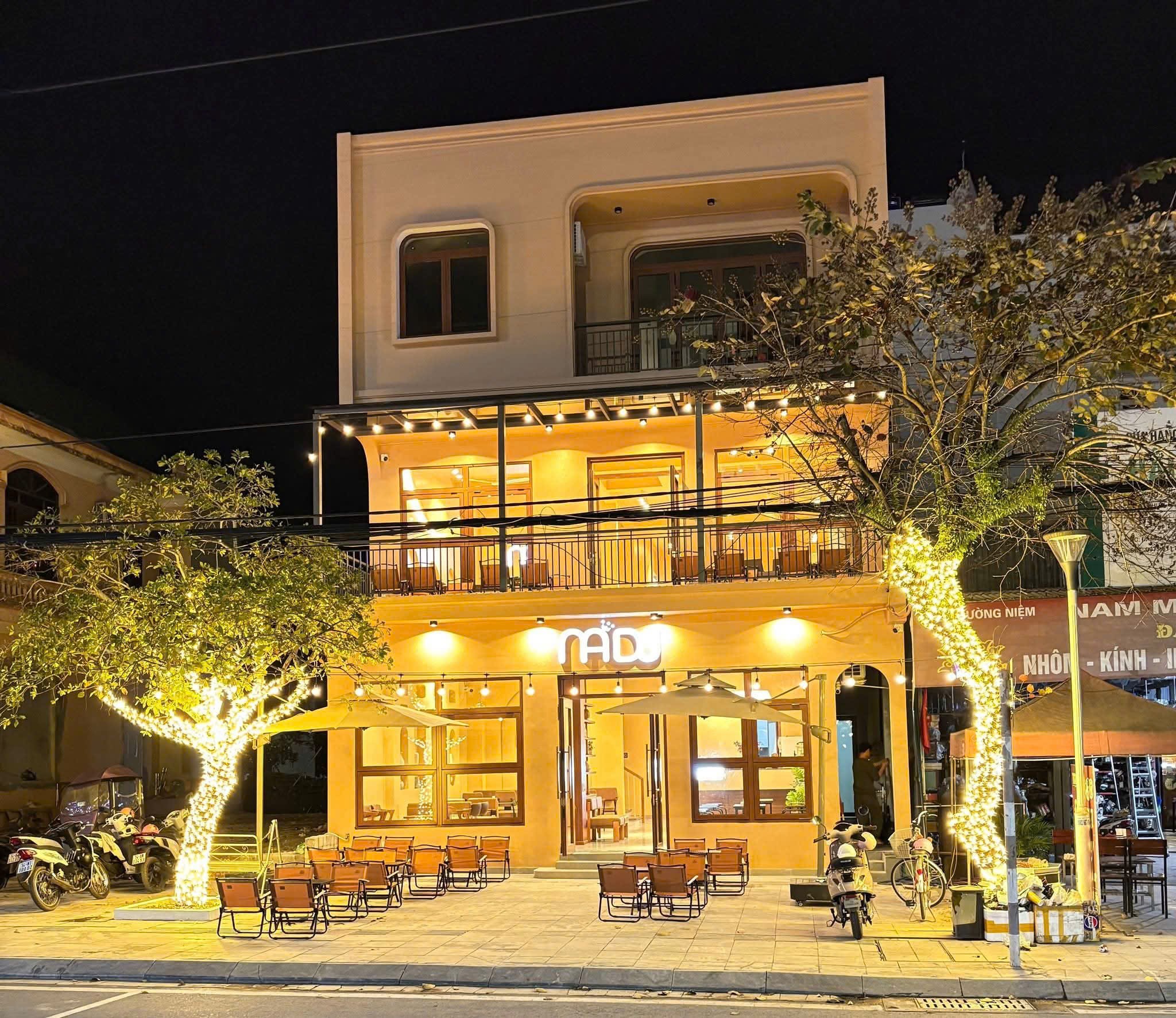 Mặt tiền quán được xử lý chỉn chu, sử dụng tông màu ấm kết hợp ánh sáng và cây xanh, tạo điểm nhấn thu hút ngay từ xa, đặc biệt nổi bật vào buổi tối.