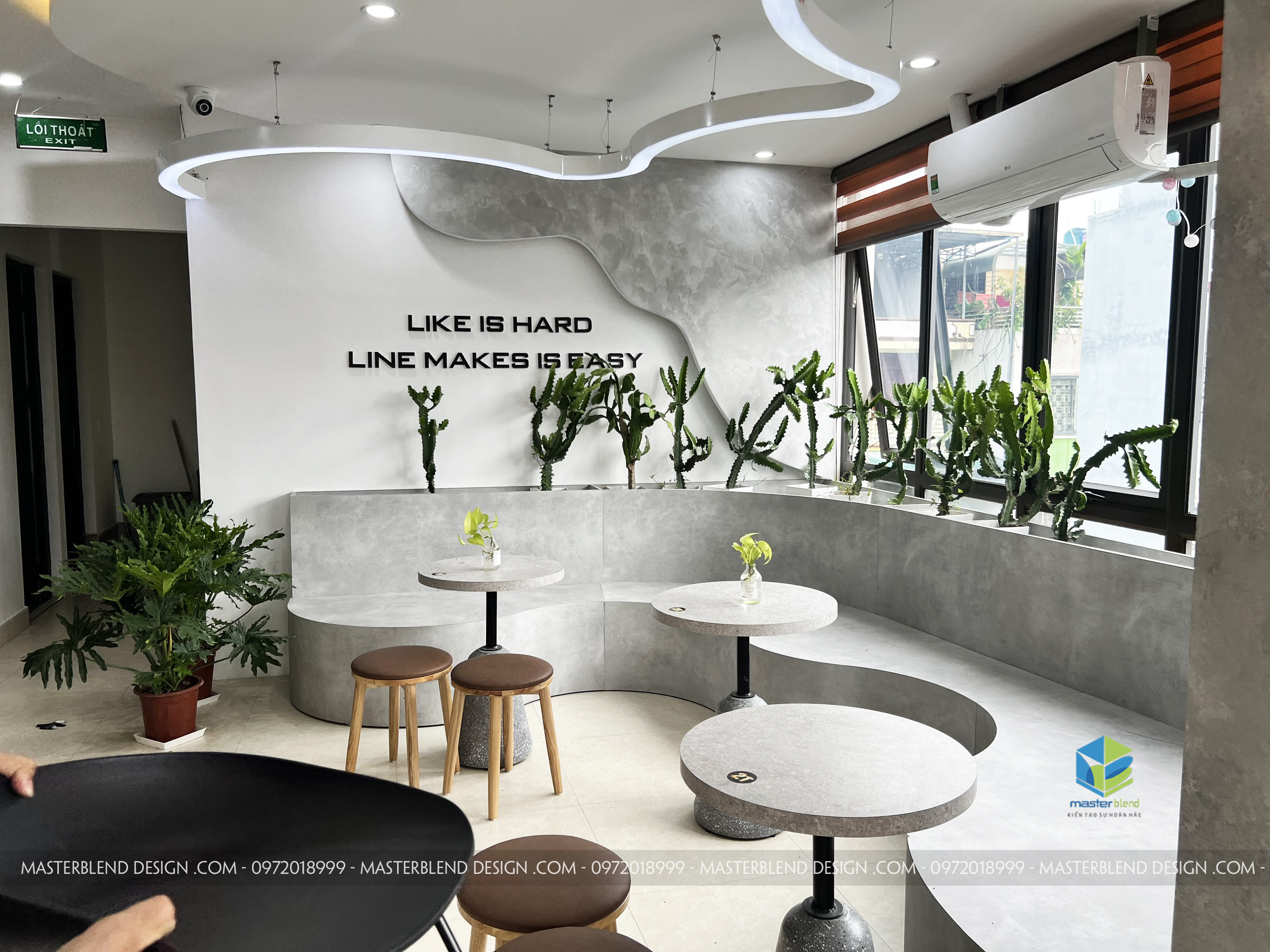 4. Cây Xanh và Trang Trí: Cây xanh được đặt khắp nơi trong tầng 3, từ các chậu cây nhỏ trên bàn đến các bồn cây lớn cạnh cửa sổ, giúp mang lại cảm giác gần gũi với thiên nhiên và làm dịu đi không gian nội thất. Bức tường trang trí với dòng chữ tinh tế “LIKE IS HARD, LINE MAKES IT SOFT” là điểm nhấn độc đáo, mang lại cảm giác động viên và tích cực cho khách hàng.